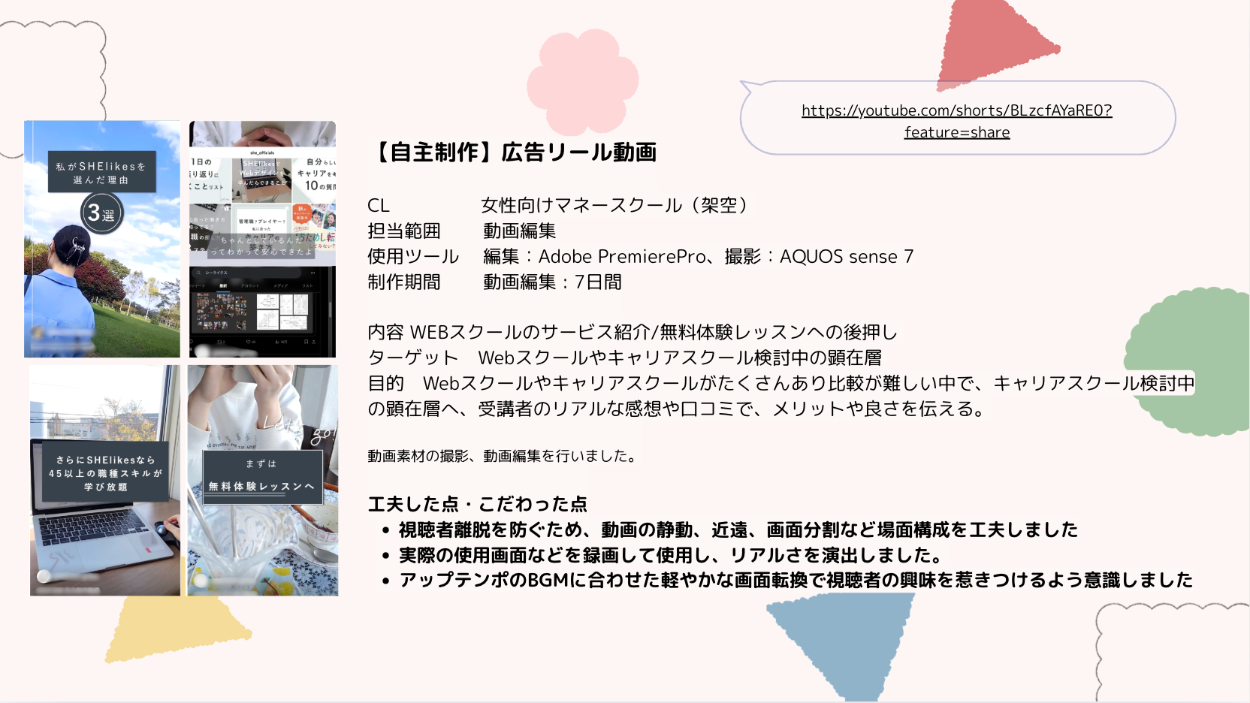 • アップテンポのBGMに合わせた軽やかな画面転換で視聴者の興味を惹きつけるよう意識しました