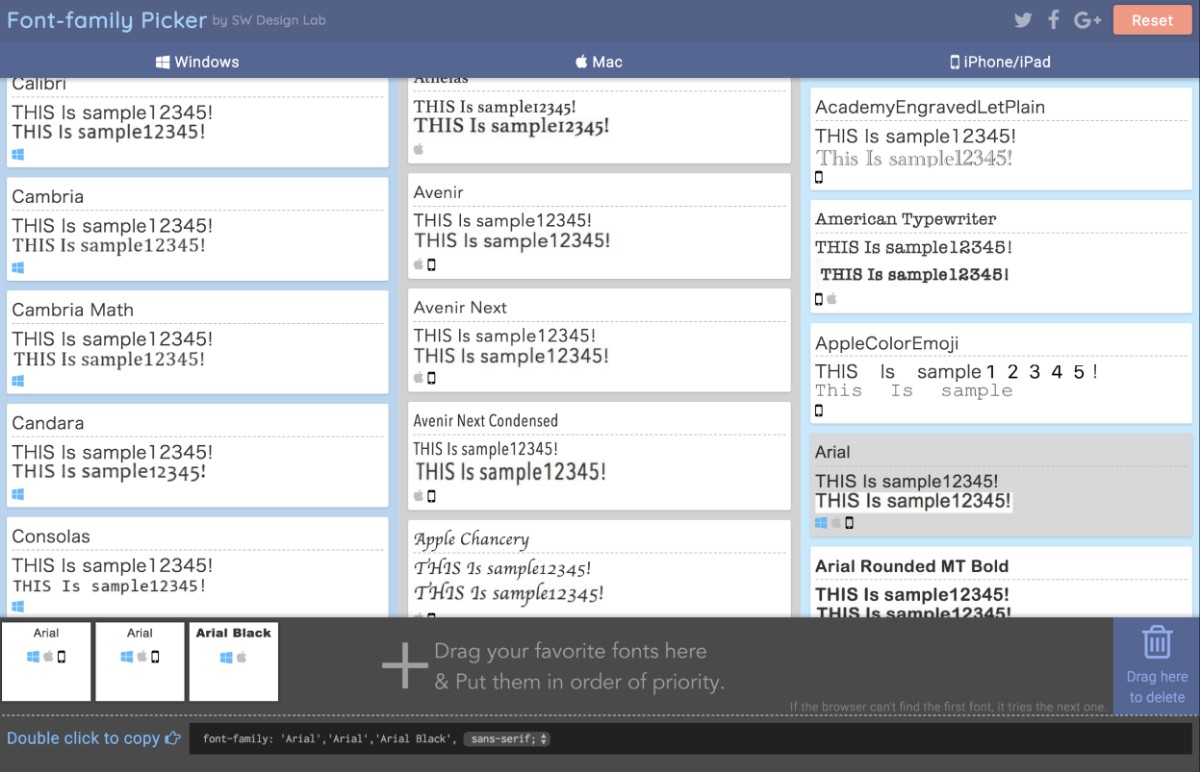 そこで、Windows、Mac、iOS(Androidはほとんどフォントの選択肢がなかった)の標準フォントをサクッと見れるようなWebツールを作りました。