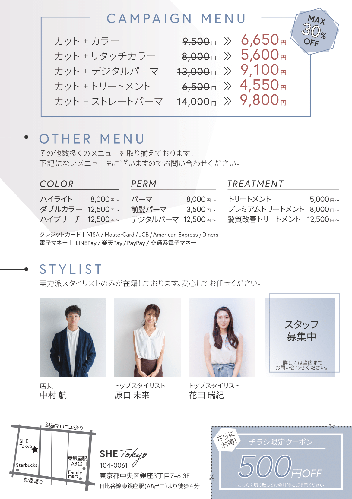 - テーマ:銀座に店舗があり少し高めの料金設定という点から、ヘアスタイルにこだわりがある女性がリピートしたくなる洗練された空間=都会的で照明ではなく自然光で明るい店舗をテーマに制作しました。