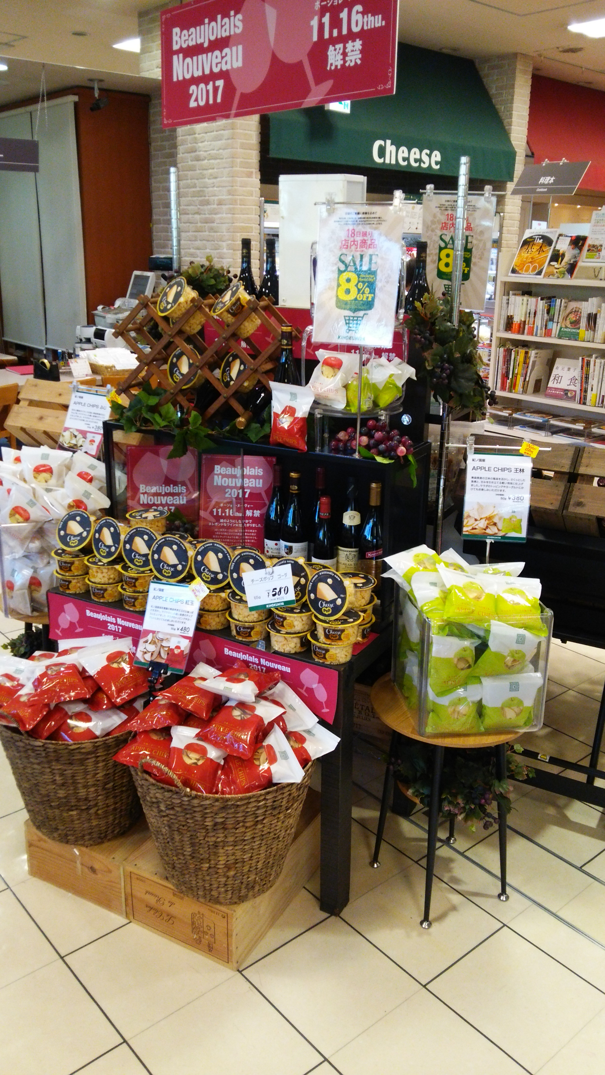 【テーマ】 ボージョレ・ヌーヴォー売り場で裏で関連商品を販売するにあたり、この年はプライベートブランドの商品が数多く開発された為、その中でも肝いりのアップルチップス3種と、カリカリに焼き上げたようなチーズを味わえるお菓子を関連販売として訴求することでワインとの相乗効果を狙う。