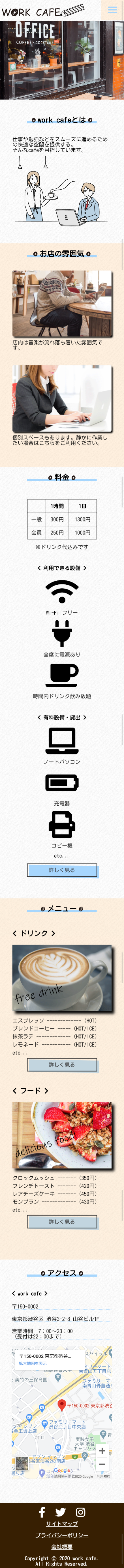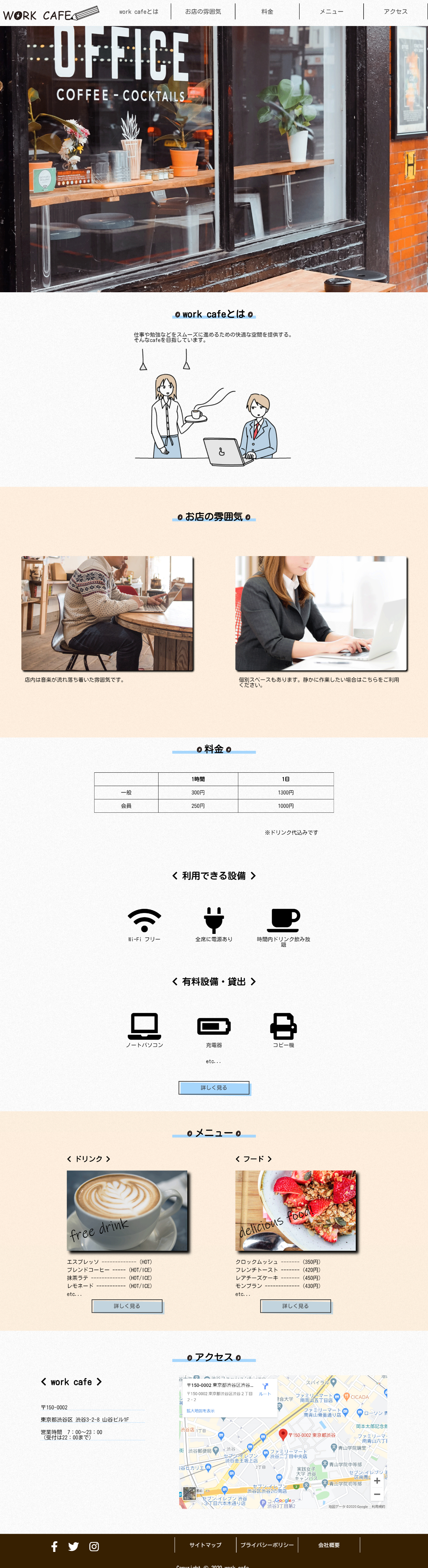 架空のカフェのwebサイト 丹 裕一 なし OVERVIEW 職業訓練校の課題で作ったwebサイトです。 YEAR 2020 サイトの説明サイトの名前はworkcafe落ち着いた雰囲気で仕事や勉強ができるカフェをイメージしましたターゲットは20代~40代後半の会社員や大学生落ち着いたお店の雰囲気を表現するため薄い茶色と水色を基調としましたまた、背景も紙質のものにし、イラストや柔らかいフォントを使用しましたレスポンシブ対応しているのでスマホとPCどちらでも見やすいように心掛けました。スマホサイトPCサイト WEBSITE