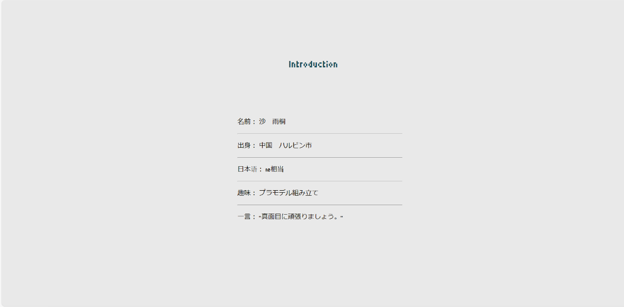 My Portfolio 沙 雨桐 イラストレーター フリーランスWebデザイナー OVERVIEW 私が作成した個人的な自己紹介ページ 学校のトピックに基づいて HTML と CSS を使用してデザイン私の自己紹介は先生の資料を参考にしました。