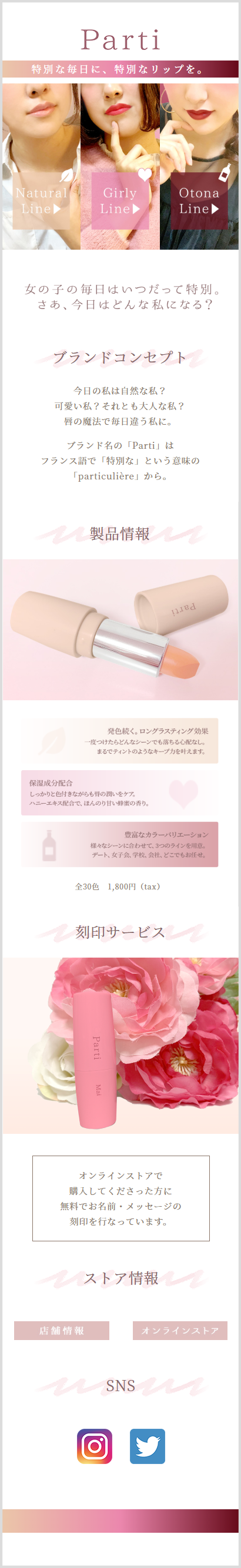 その日の気分や予定で色んな自分になりたくなる、そんな女の子のための新しいコスメブランドです。 シーンに合わせて、それぞれに合った商品を展開していきます。