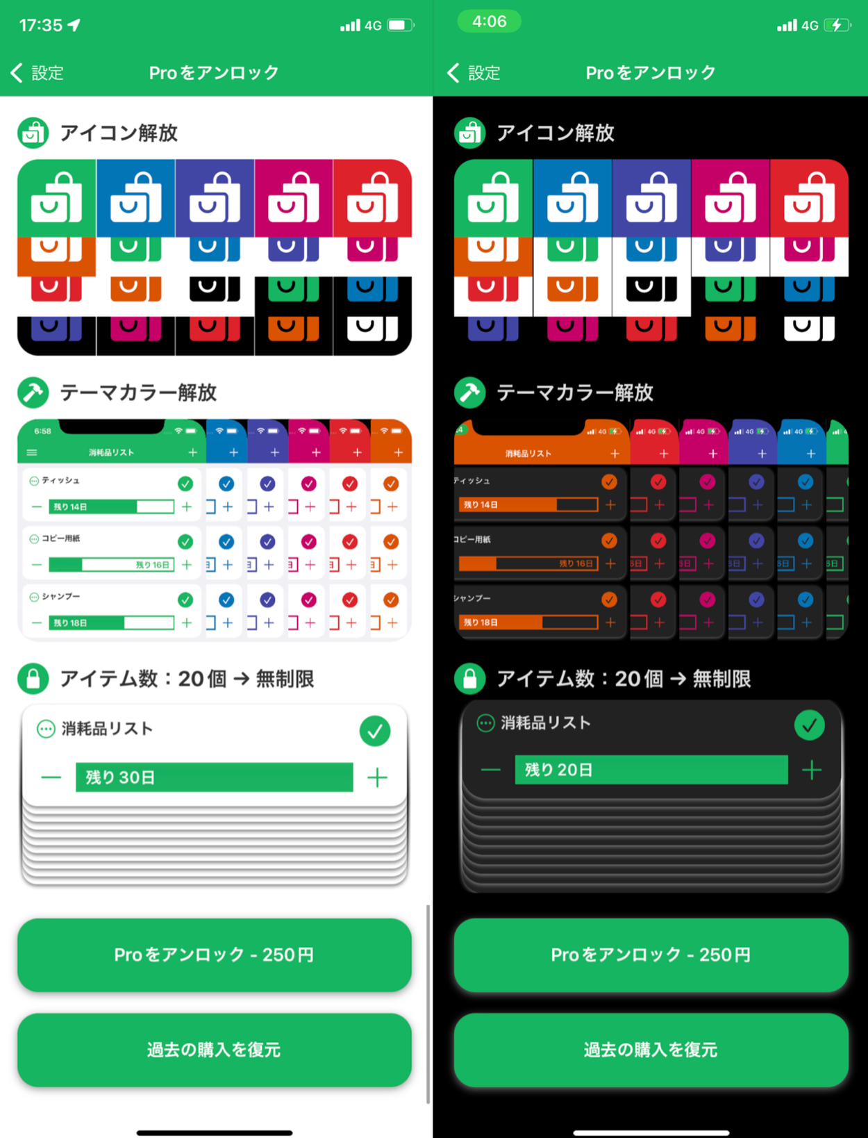 本来のこのアプリの役割的にはアイテムの上限解放以外必要ありませんが、少しでも多くのユーザーに購入してもらうため、おまけとしてテーマカラーとカスタムアイコンを実装しました。
