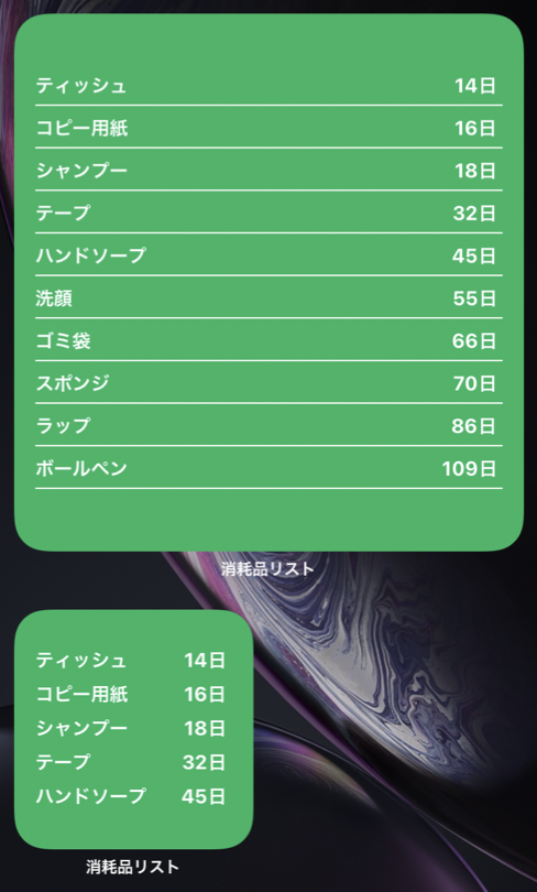 消耗品を残り日数が少ない順にウィジェットに表示しています。大サイズのデザインのままだと小サイズのウィジェットにほとんどアイテムが入らないため、小サイズだけ別デザインに切り替えています。