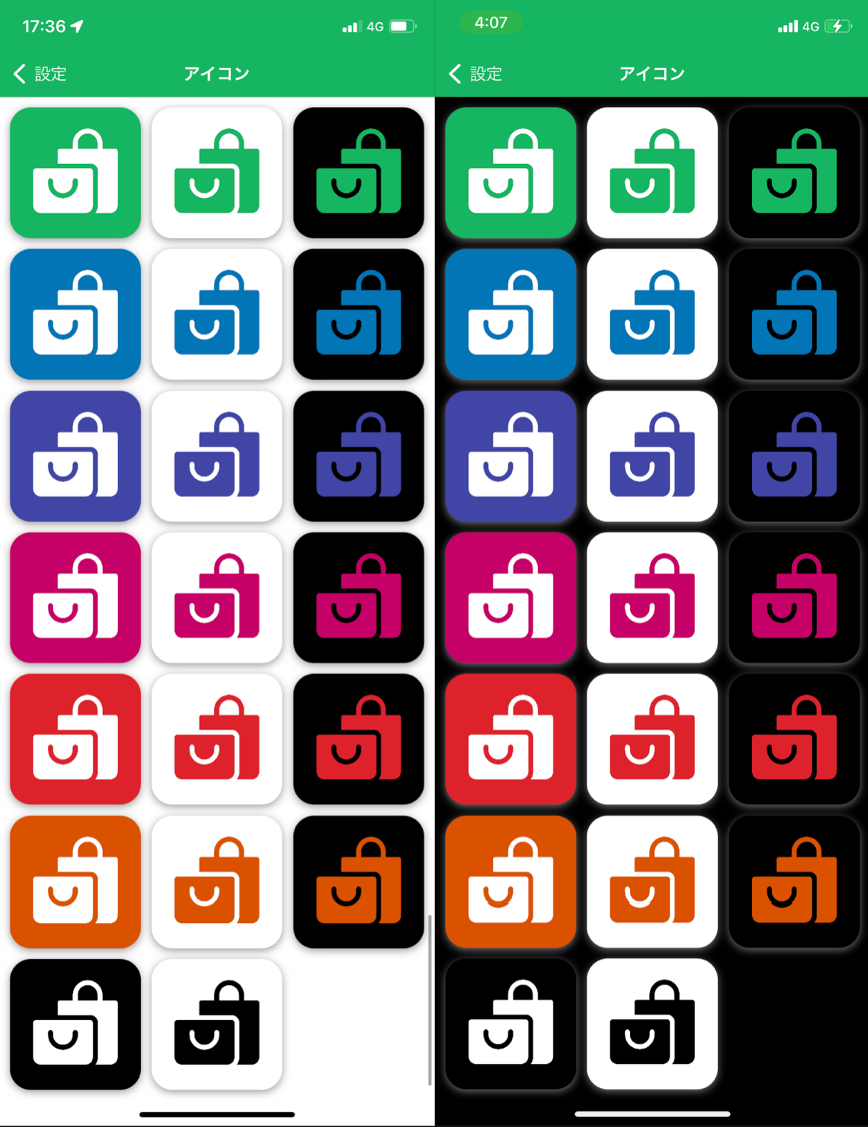 アイコン一覧から好きなものをタップするとアプリアイコンが切り替わります。テーマカラー6色×3パターンと白黒のアイコンを合わせた合計20個の選択肢を用意しています。