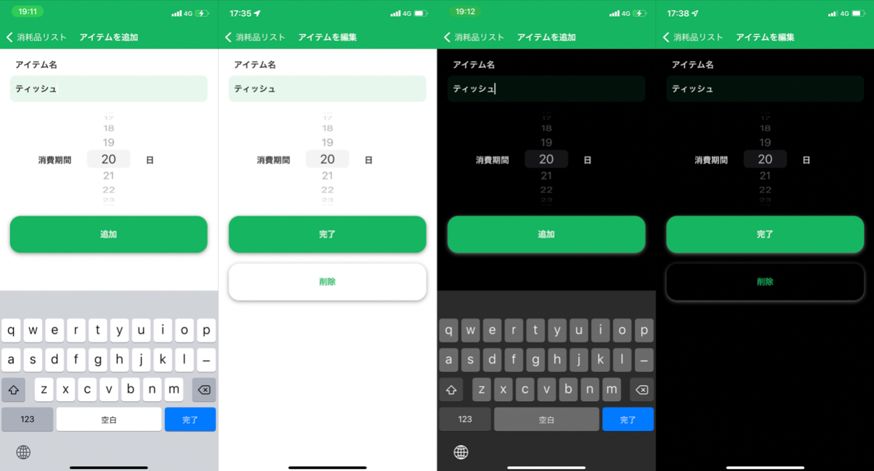 アイテムを名前と消費期間を決めて追加/編集をします。キーボードは「完了」ボタンと背景タップの2パターンで閉じる仕様にし、ストレスなく操作出来るようにしました。