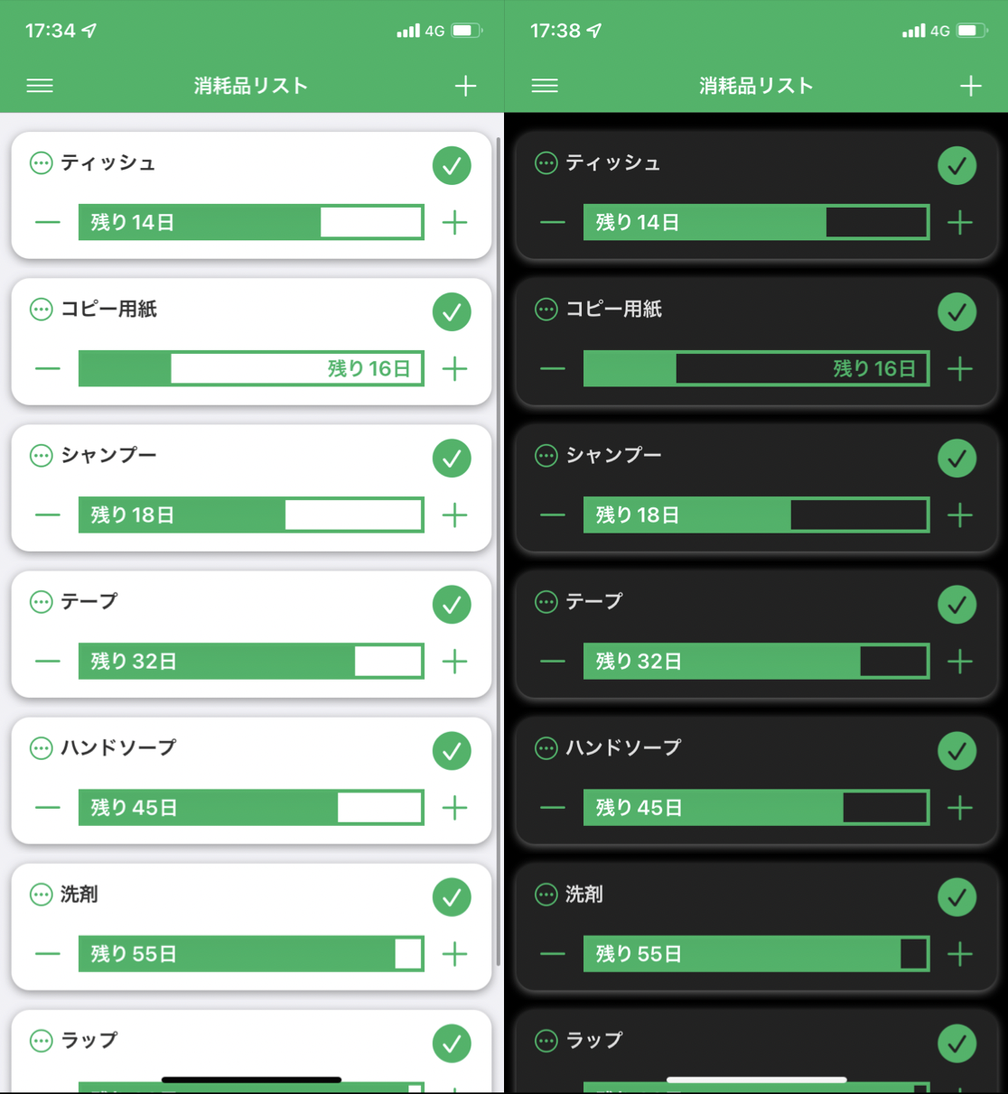 消耗品を残り日数が少ない順に表示しています。セルには消耗品の名前と残り日数、編集ボタン、1日単位で残り日数を調整するボタン、残り日数を完全に回復するボタンを設置しています。