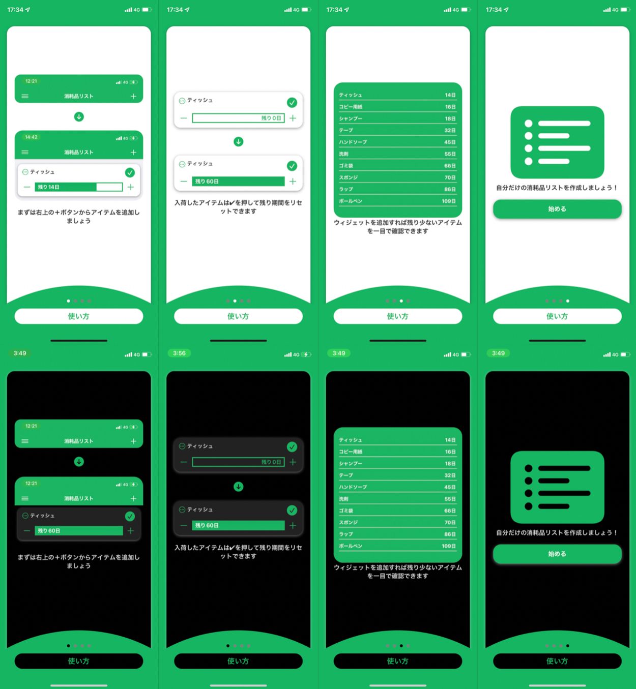 初回起動時に使い方のスライドが表示されます。なるべく簡潔にアプリ全体の趣旨を理解してもらえるように作りました。