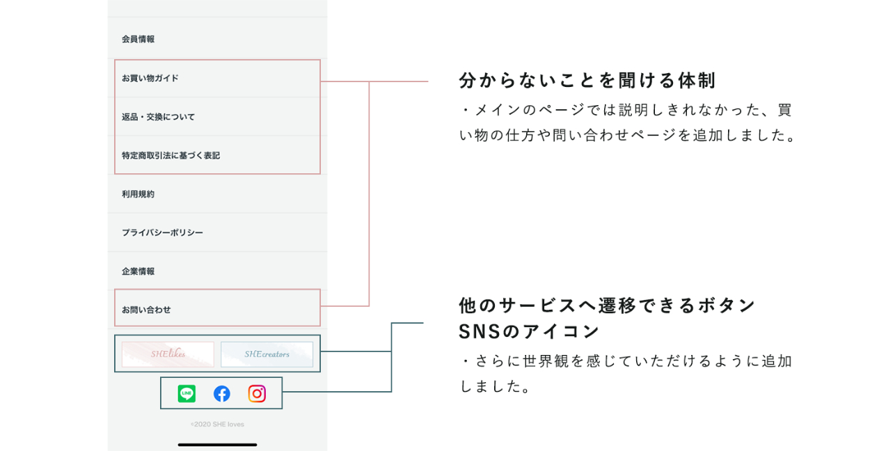今回の制作目的として、商品の購買を促すことももちろん必須ですが、SHElovesを含めたSHEのサービスのファンになってもらうことも目的だと考えました。そこで、操作性を高めるだけではなく、SHEの世界観が伝わる要素も取り入れました。