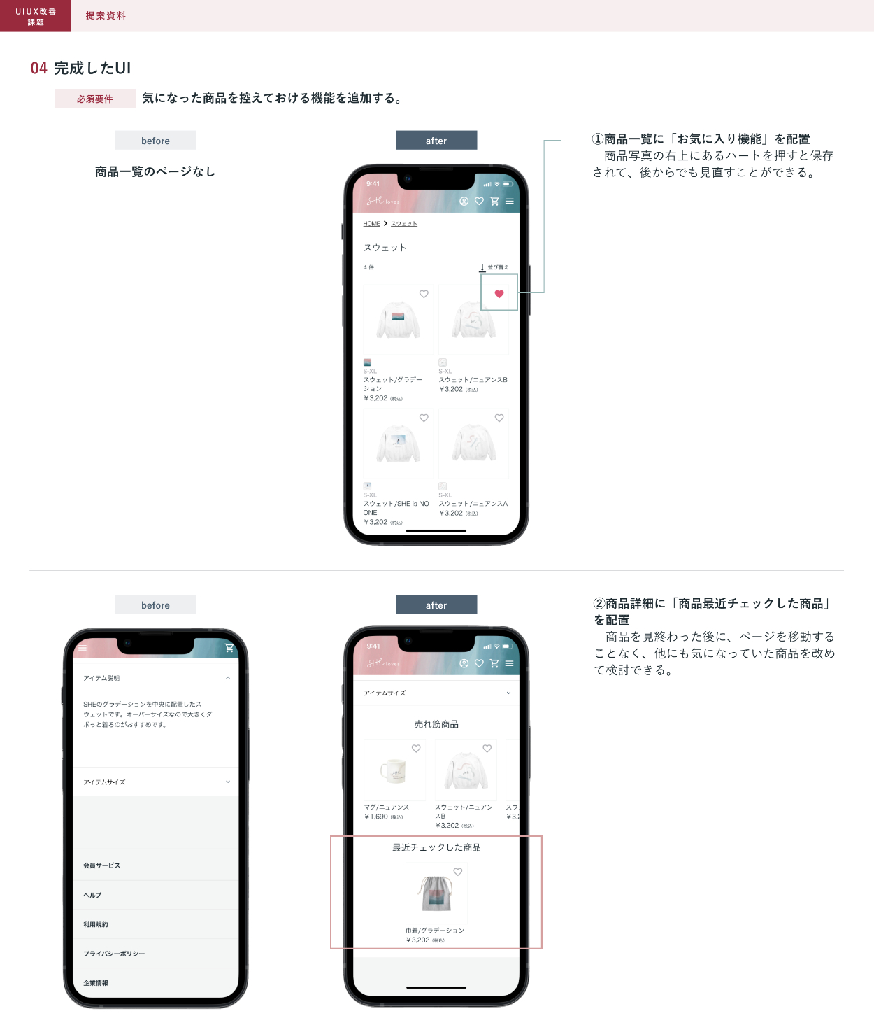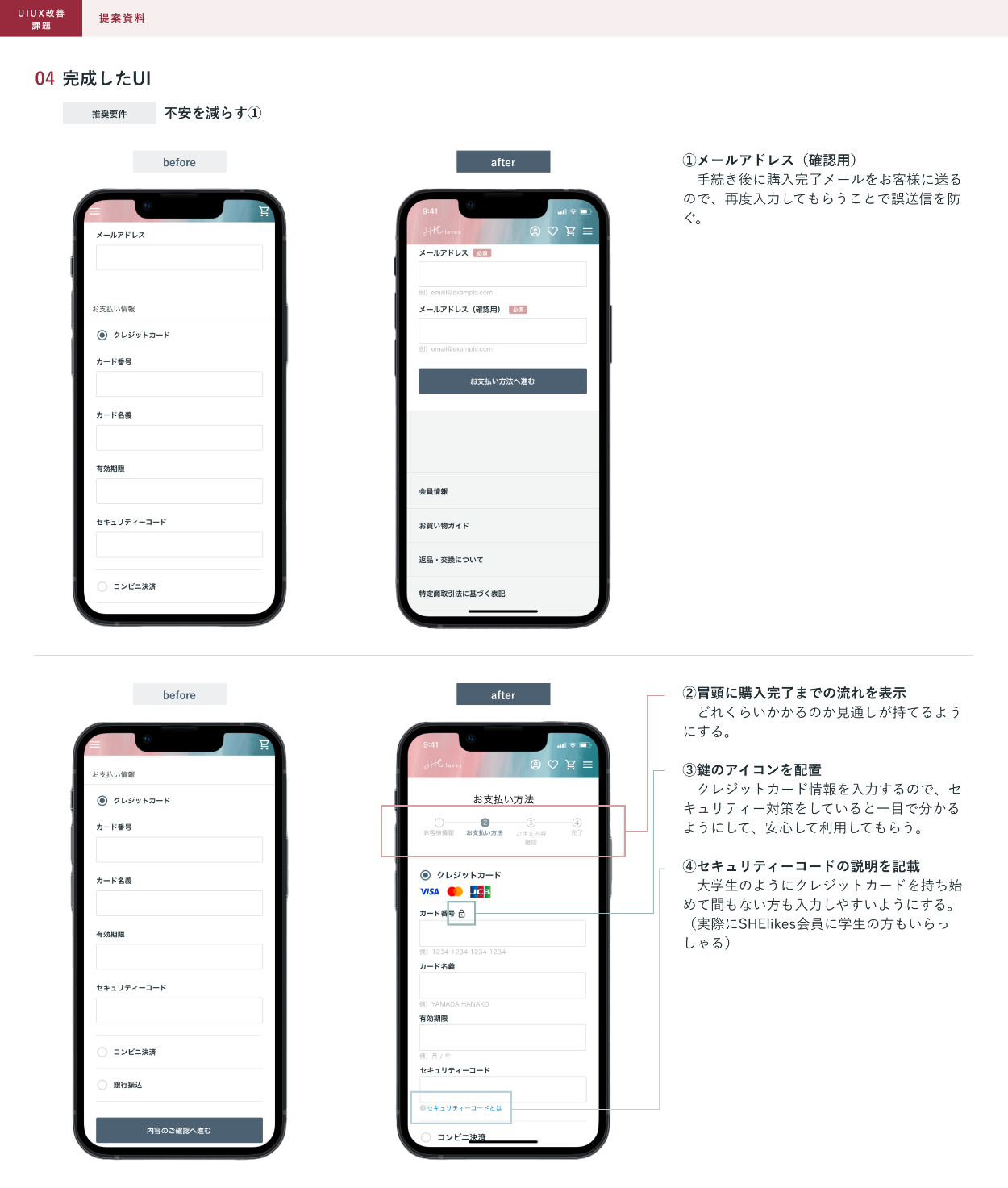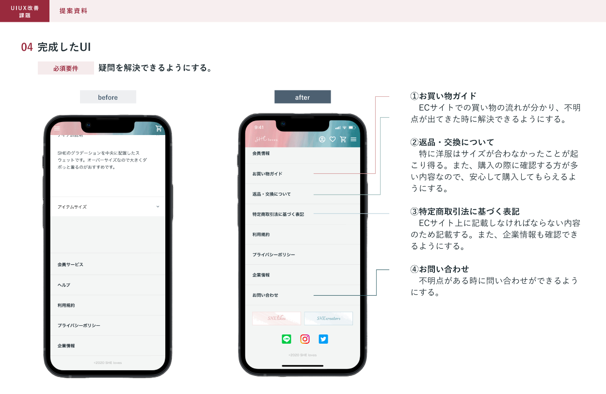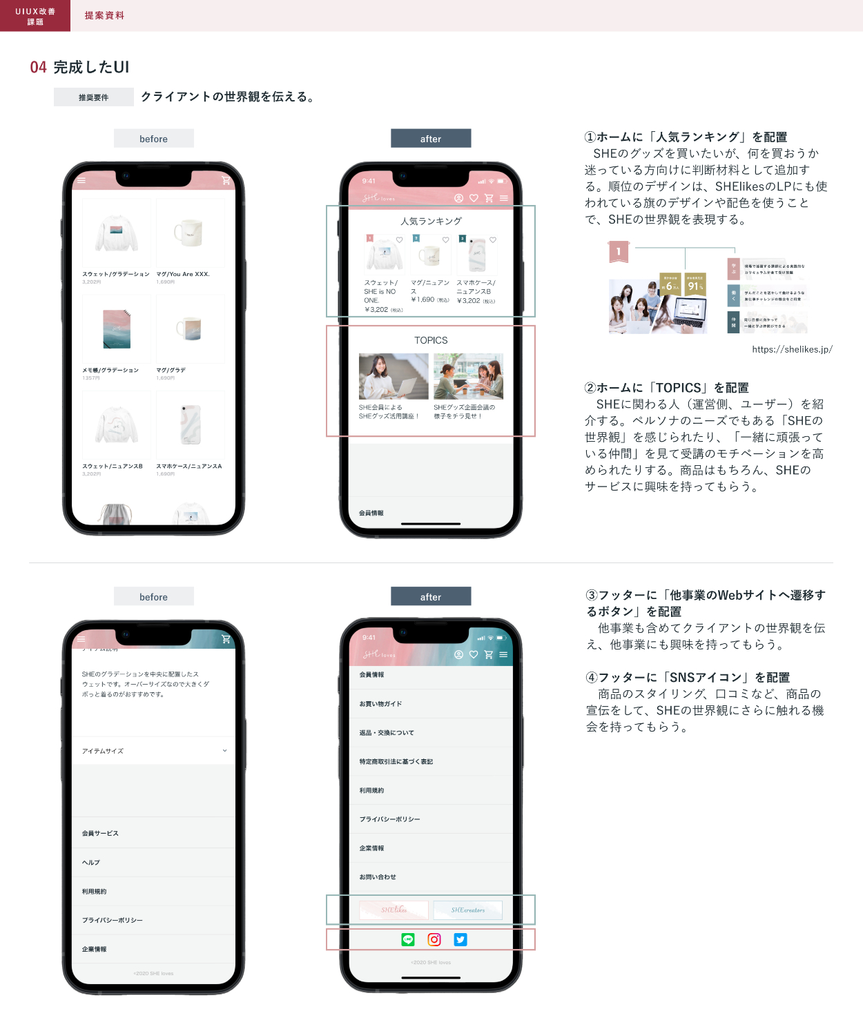 SHElikes MULTI CREATOR PROJECTにて、ECサイトのUI/UX改善の課題に取り組みました。クライアントから共有された課題について、発生している要因を考え、解決案を提案しました。 (制作時間:約40時間)