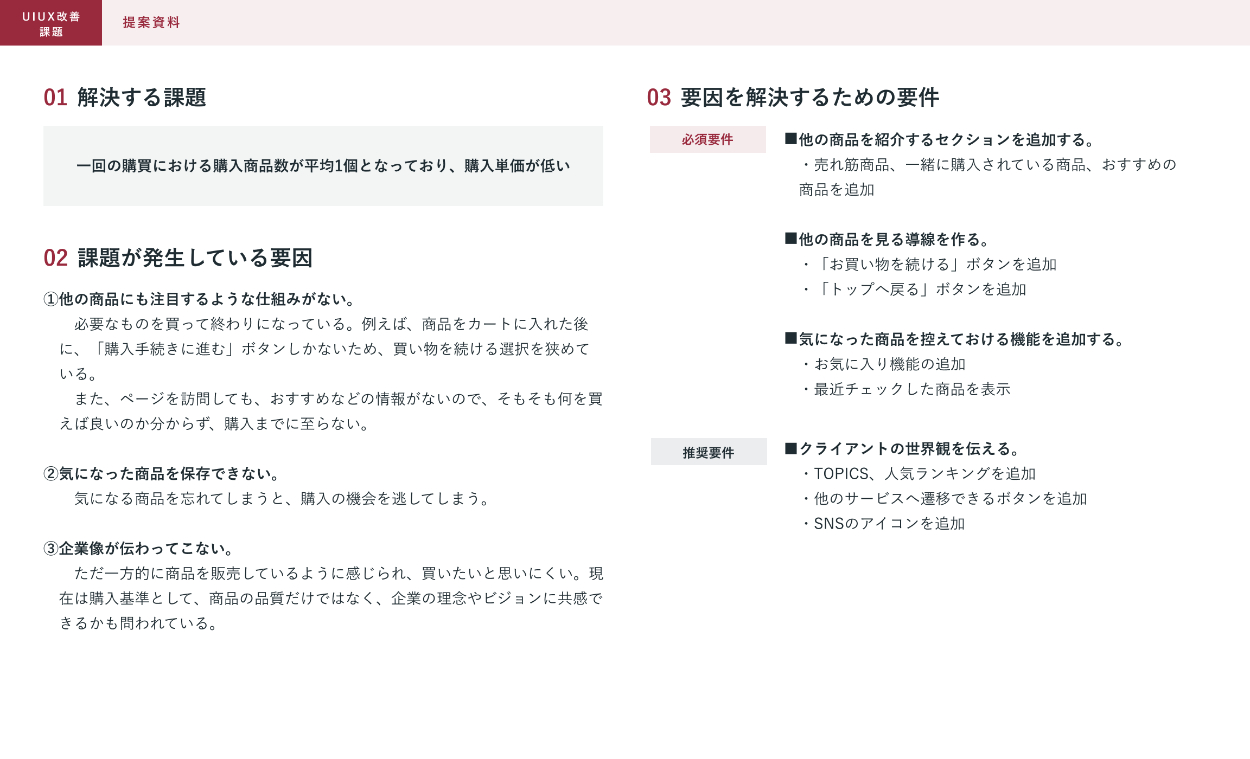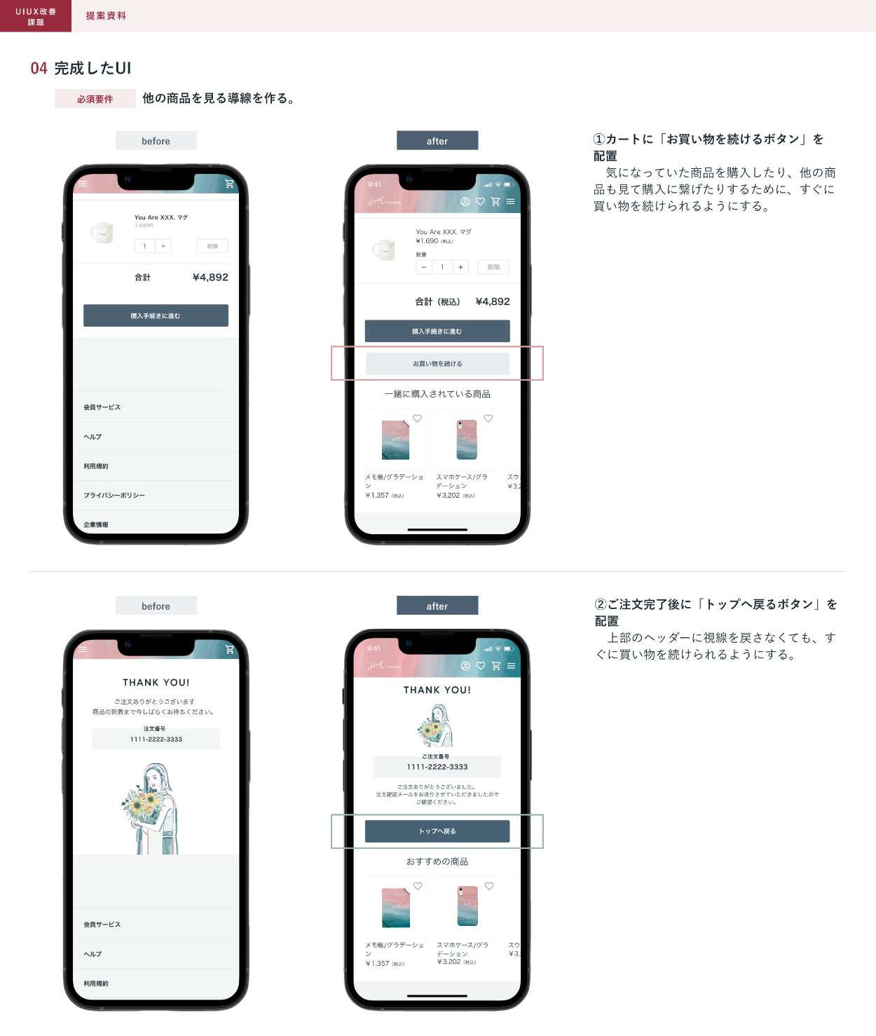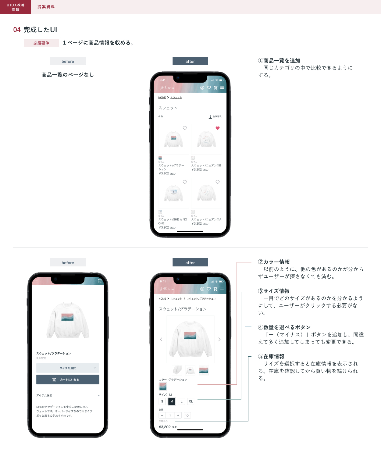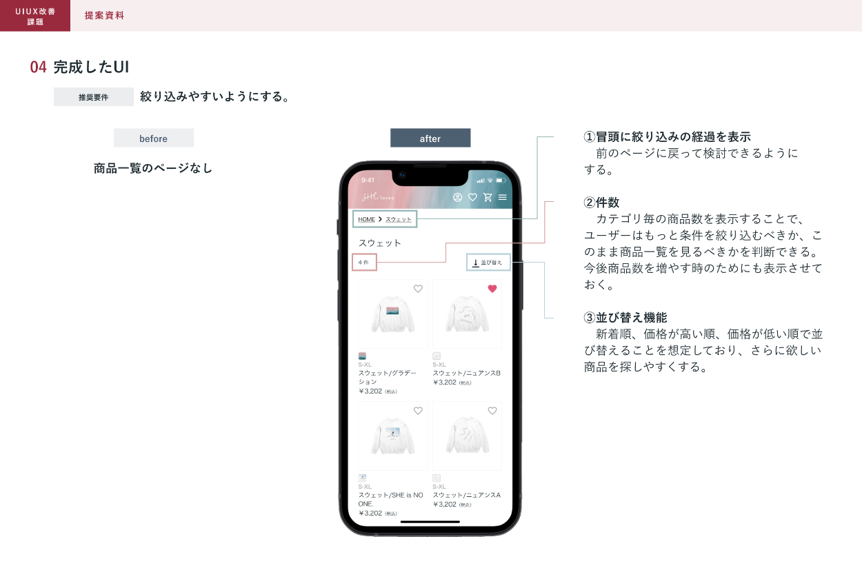 SHElikes MULTI CREATOR PROJECTにて、ECサイトのUI/UX改善の課題に取り組みました。クライアントから共有された課題について、発生している要因を考え、解決案を提案しました。 (制作時間:約40時間)