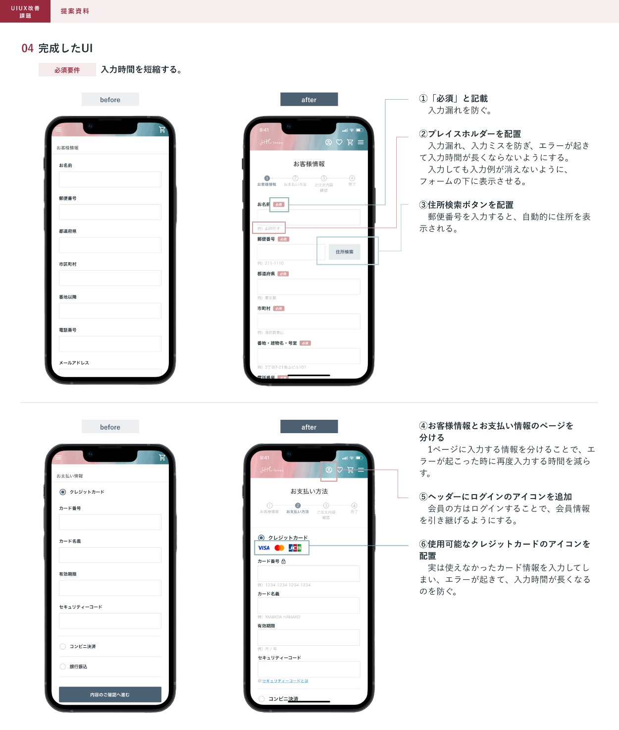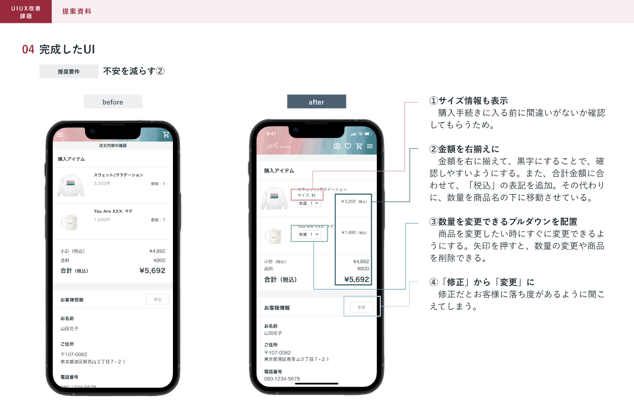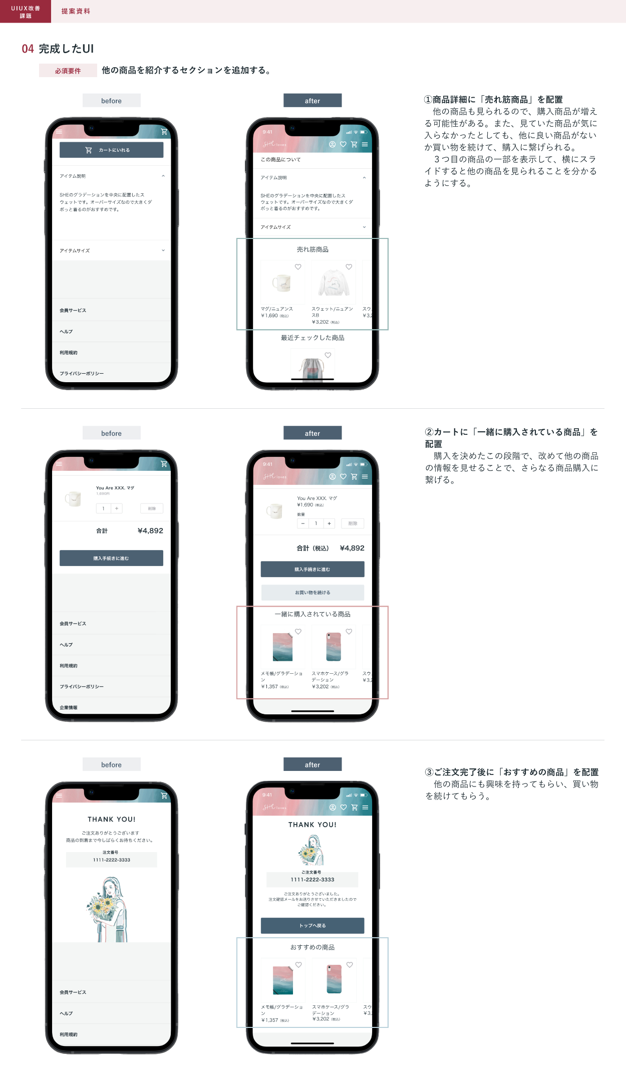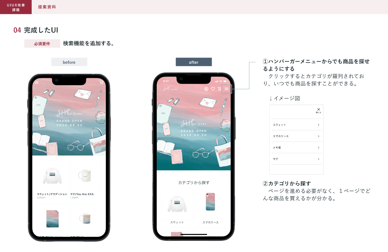 SHElikes MULTI CREATOR PROJECTにて、ECサイトのUI/UX改善の課題に取り組みました。クライアントから共有された課題について、発生している要因を考え、解決案を提案しました。 (制作時間:約40時間)