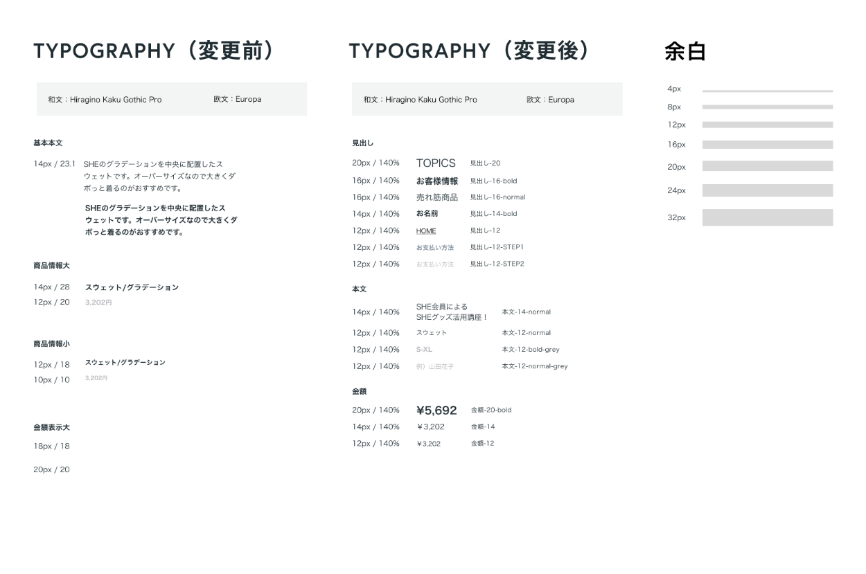 元のルールから、TYPOGRAPHYをより細かく決め、余白は4の倍数で設定しました。