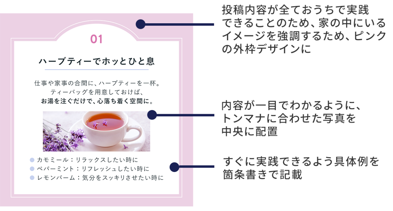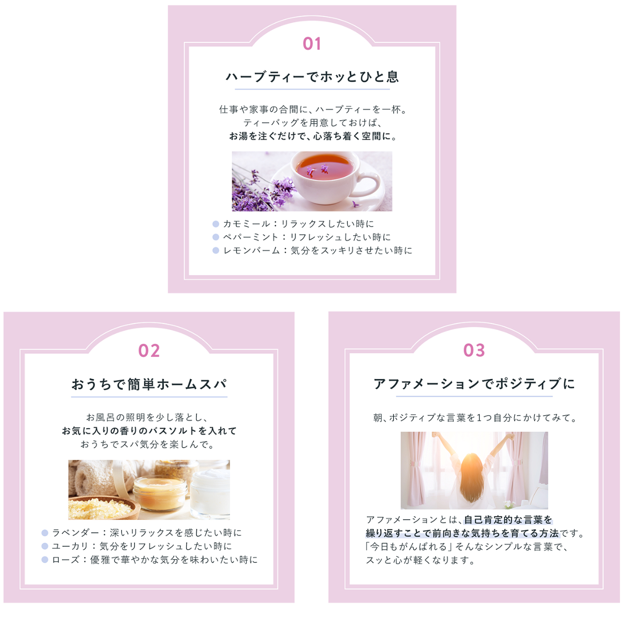 - なにか事前準備が必要なことは毎日継続するには負担が大きいと考え、「お湯を入れるだけ」「バスソルトを入れるだけ」「声に出すだけ」といったあまり考えなくても実践できる内容としました。
