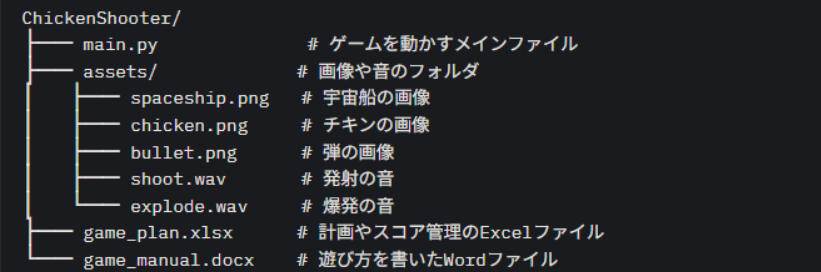 - 管理: Excelで画像や音のリスト、スコアのテスト表を管理。Wordで遊び方を書く(例:「矢印キー:移動、スペースキー:発射」)。