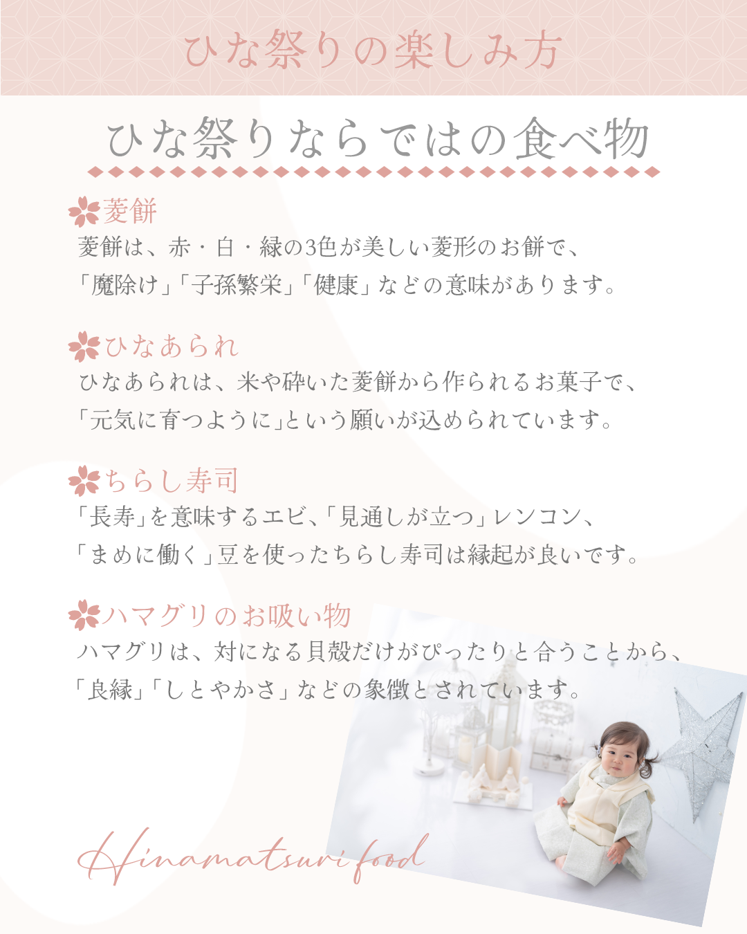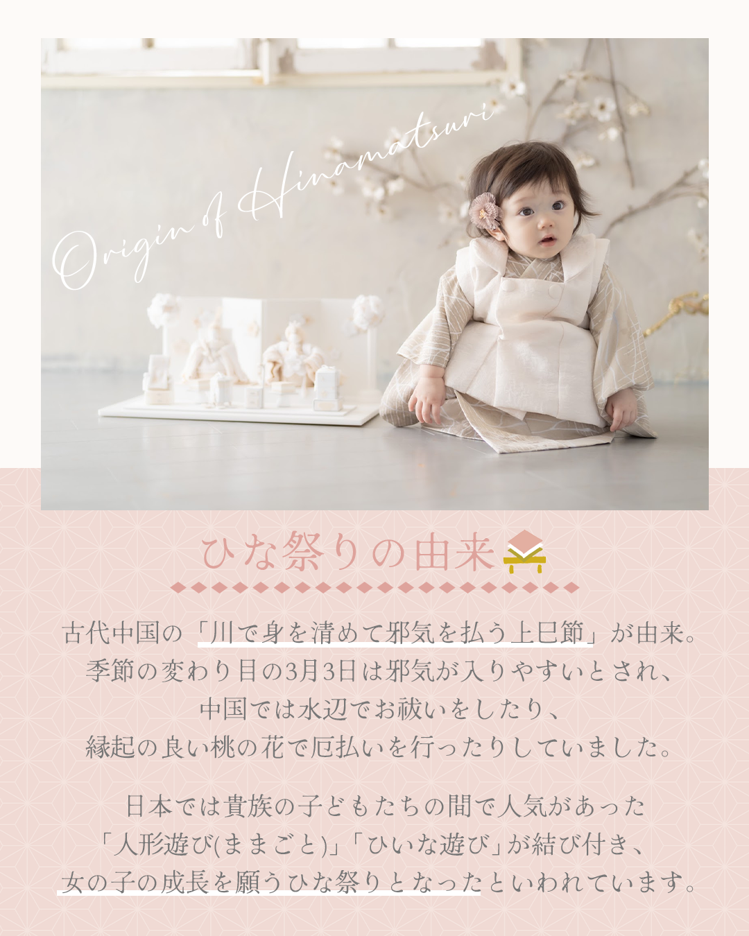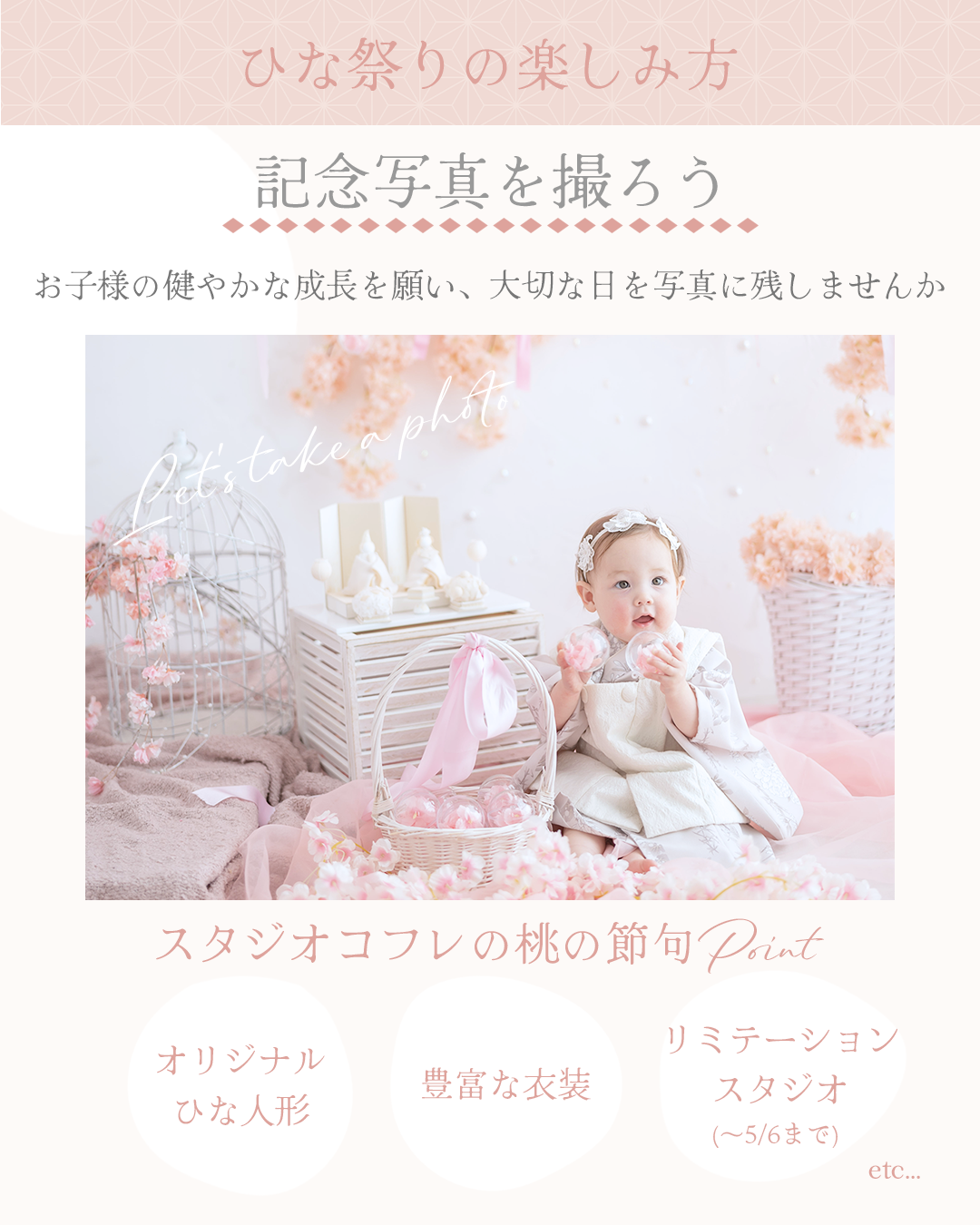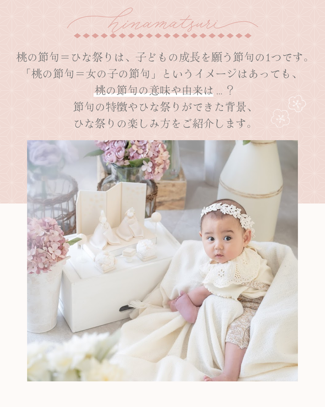 桃の節句の時期に、「桃の節句の由来」や「桃の節句の楽しみ方」をご紹介し、最後にスタジオでの撮影をオススメする流れに。