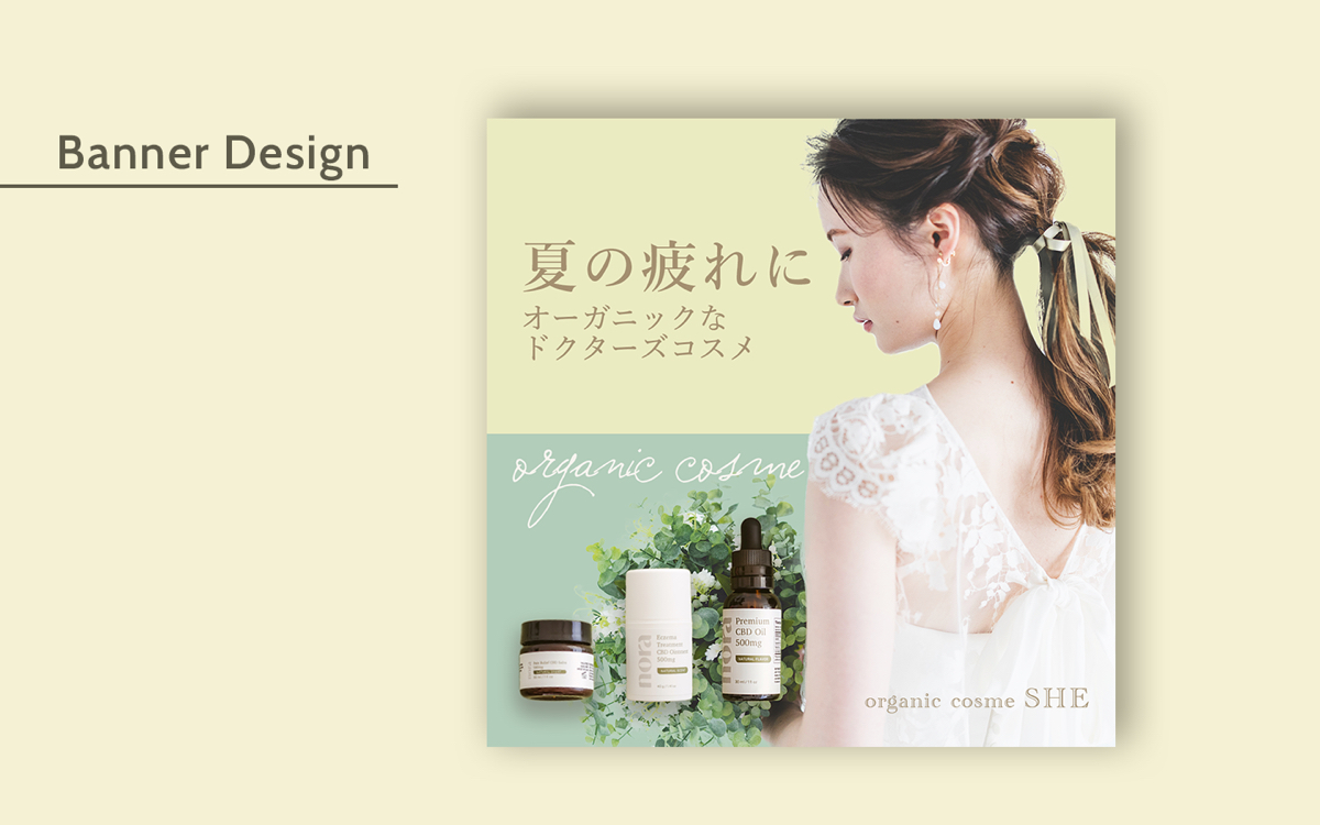 【作成のポイント】女性が好みそうなテイストの色・フォントを検討する。商品写真はすでに完成された世界観なので、どのように文字を入れるか、イメージ写真とどのように使い分けるか。SNSバナーはテキストが別であるので、ビジュアルを重視する。