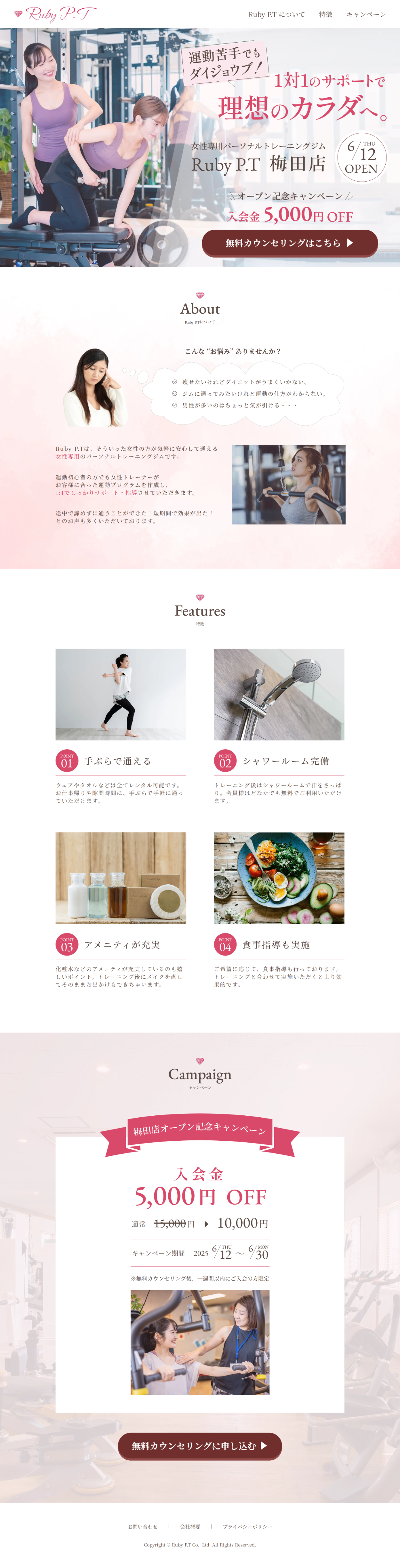 1:1のパーソナルトレーニングが受けられるジムであること、女性専用であること、オープン記念キャンペーンで入会金が5,000円OFFになること等も、メインビジュアルを見ただけで伝わるようにしています。