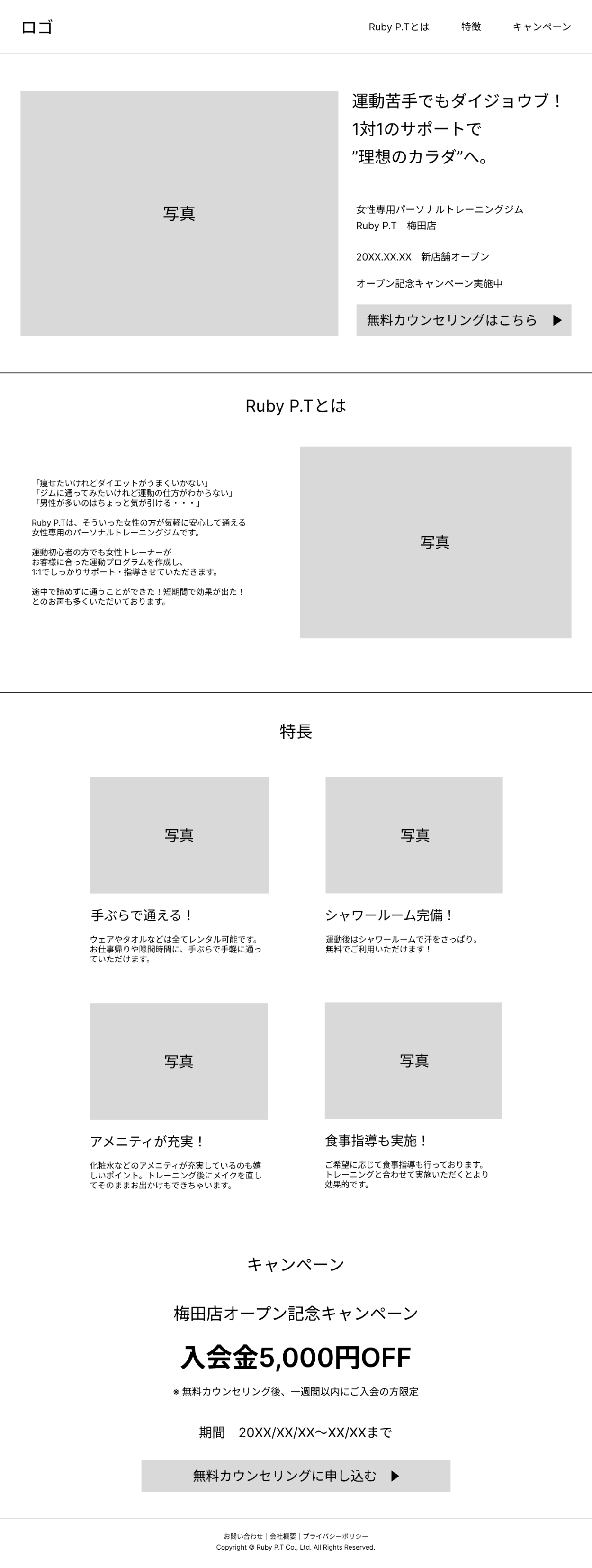 お客様の声を掲載しながら、Ruby P.Tの概要が伝わるようにしました。3rd viewまで読み進めてもらえるよう、Ruby P.Tの魅力を伝えることを意識しました。