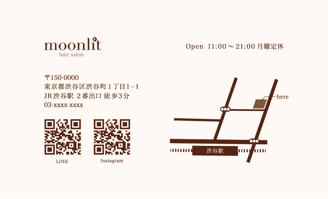 裏面の背景色をナチュラルベージュにして表面とのカラーの統一感を出し、サロン様のナチュラルでほっこりした雰囲気を全体的に感じられる配色にしました。