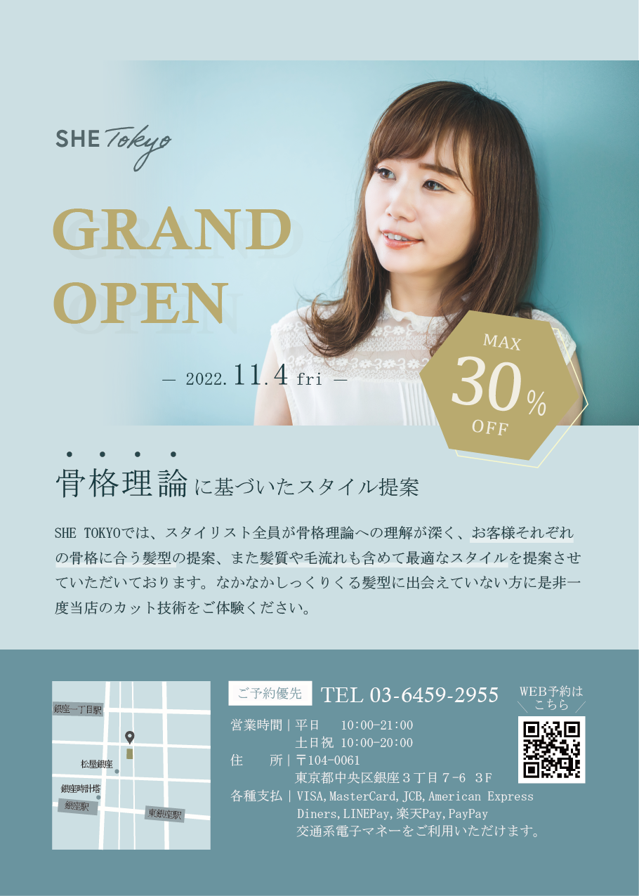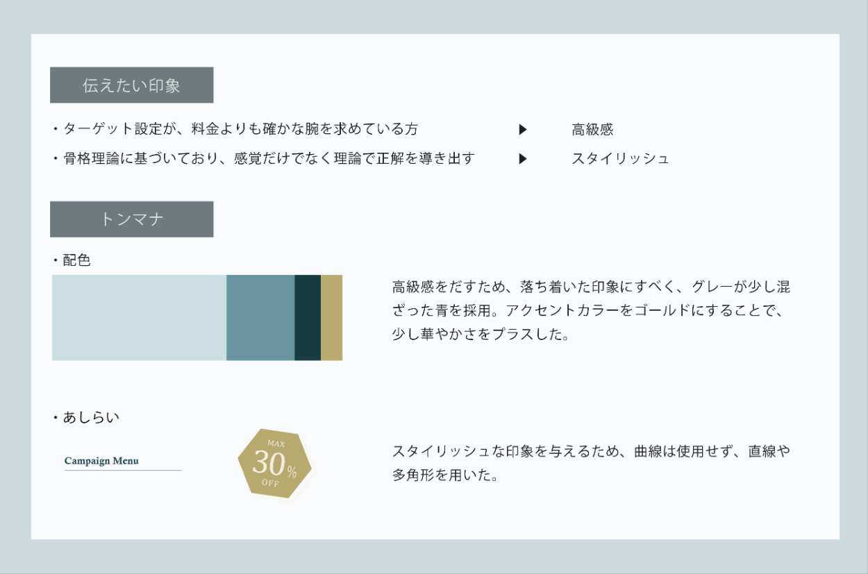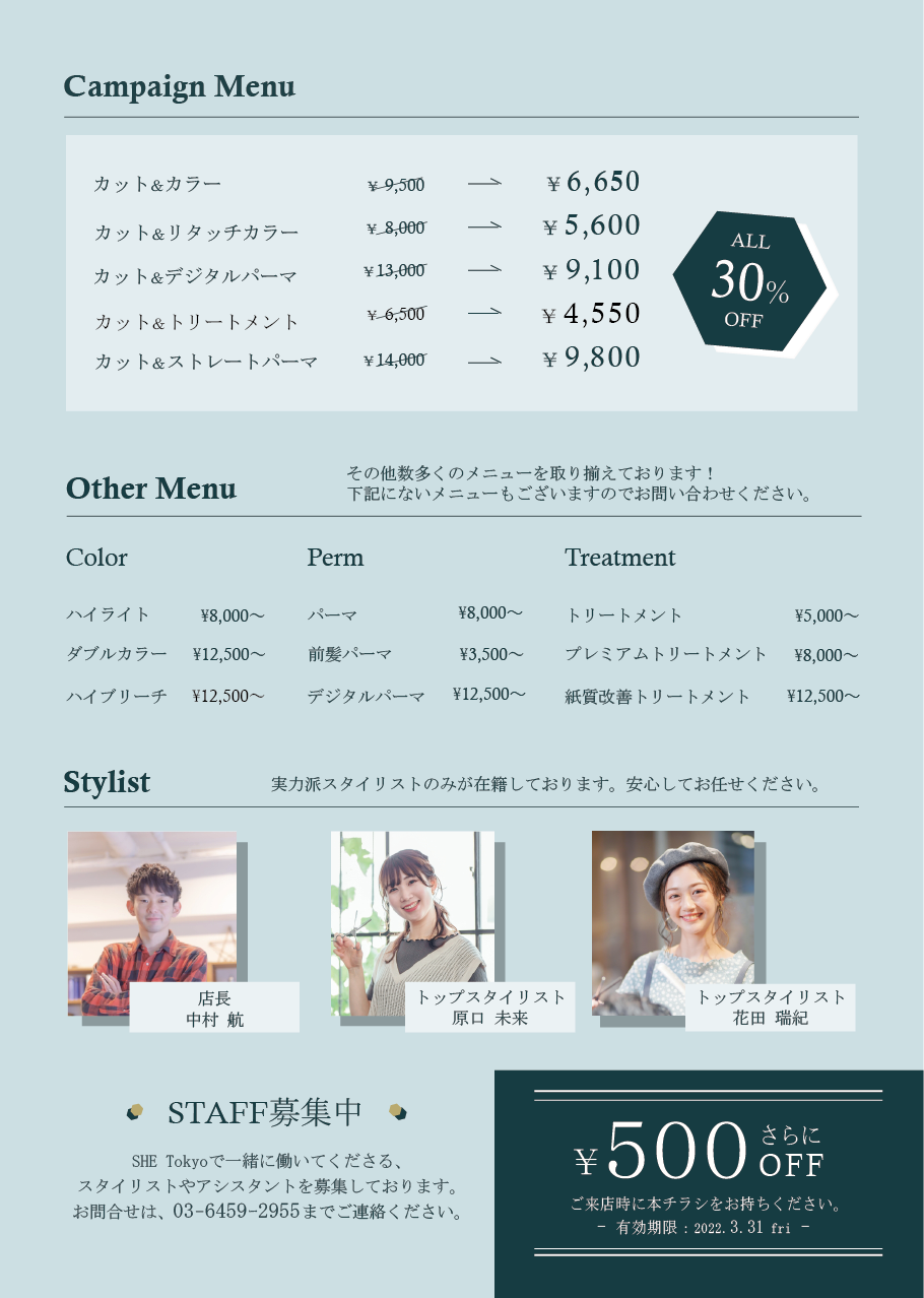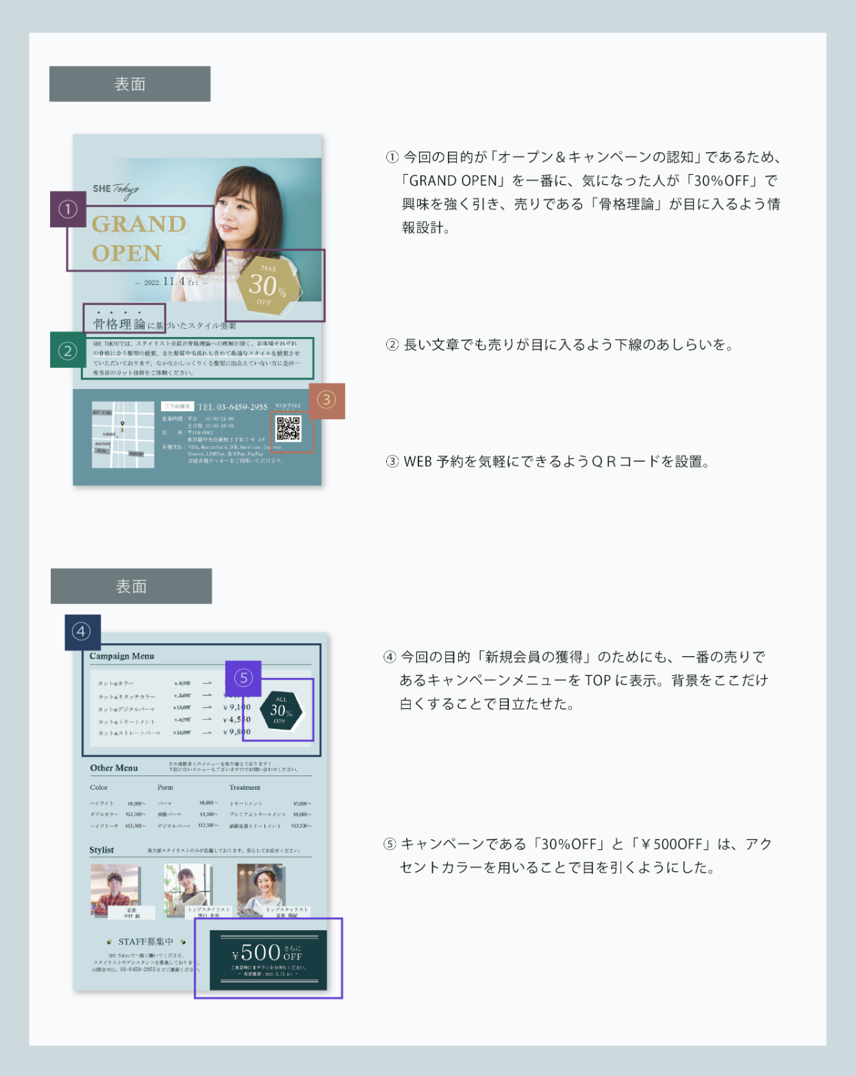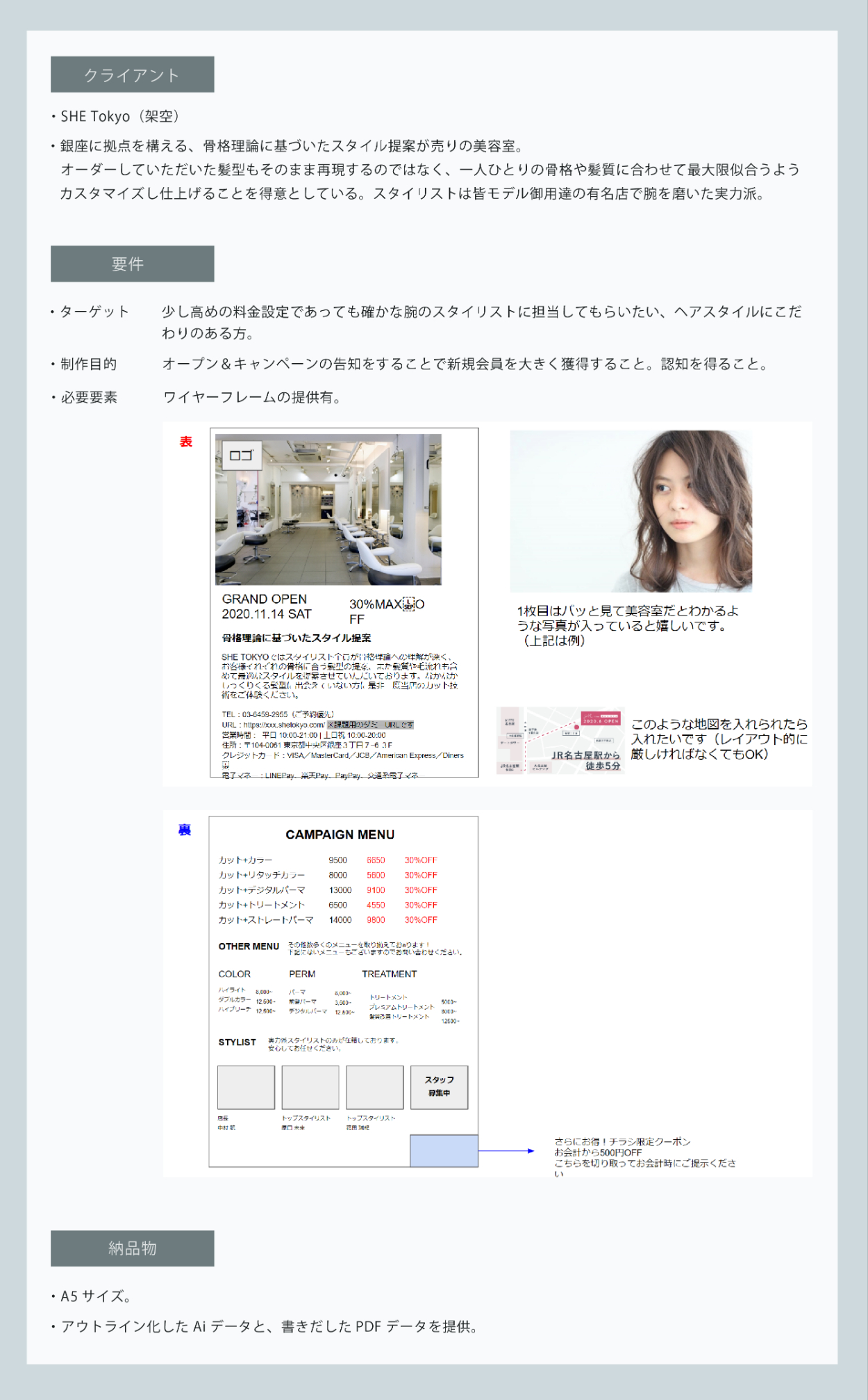 美容室のフライヤー作成に取り組みました。銀座店かつ料金よりも腕を求める顧客をターゲットとしていることから、落ち着きや高級感を大事にしつつ、作成目的である新規オープン&キャンペーンが目に留まるよう作成いたしました。
