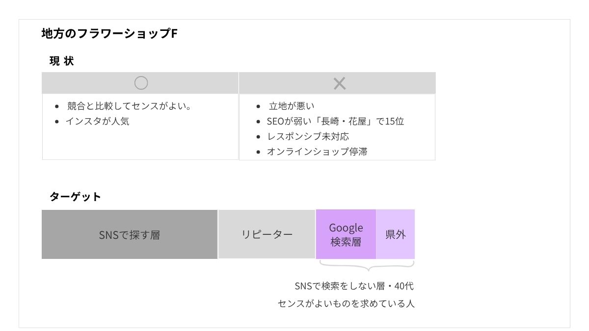 地方の花屋のWeb改善提案。人気のInstagramに対し、HP閲覧数は少なく、SEO・UI/UXに課題。ターゲットは送別用の花を贈る機会が多い40代女性。SNSは眺めて楽しみ、情報収集にはGoogle検索などを使う層を想定。