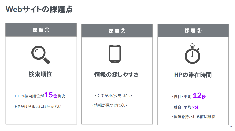 HPも集客の起点とする → 平均滞在時間5倍(現在 12秒→60秒)に改善
