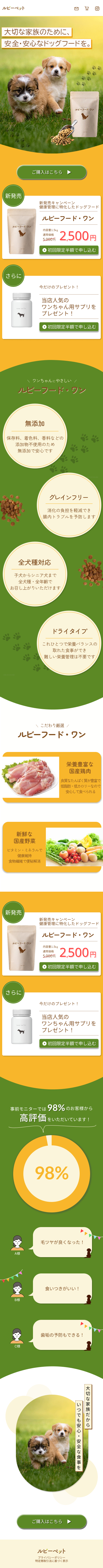 愛犬の健康管理フードなので、かわいい元気な印象のあるLPをお願いします。