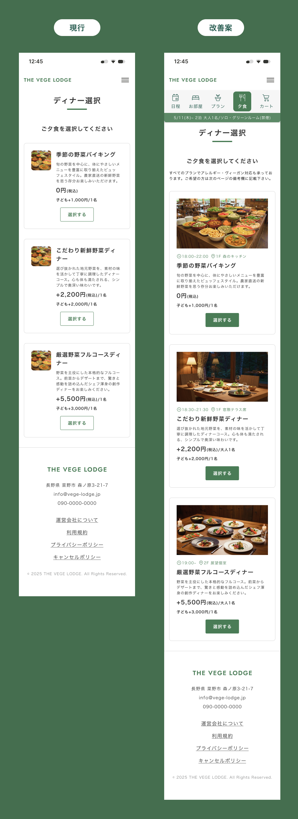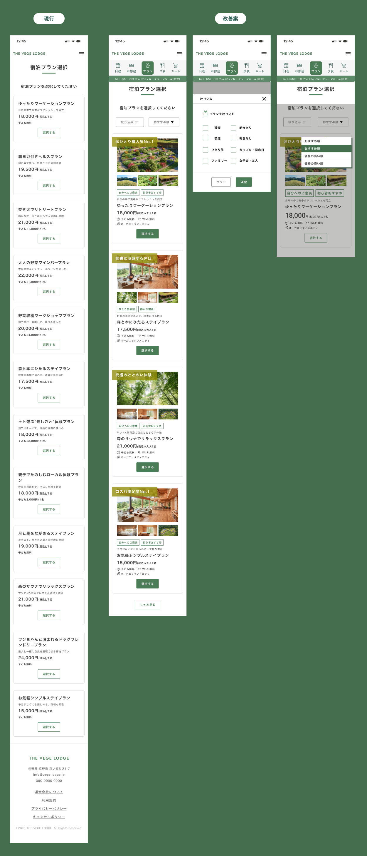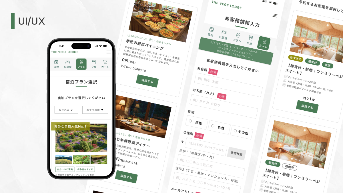 「野菜がたのしい。」のコンセプトで惹かれたユーザーに対し、最も重要な宿泊プランのデザインがテキストのみになっていたため、体験イメージが湧きにくい状態でした。そこで、写真を複数配置して視覚的な魅力を伝えるよう工夫しました。また、豊富なプラン数による「スクロール疲れ」を防ぐため、絞り込み機能を追加し、 ユーザーが自分にぴったりの体験を迷わず見つけられる設計を目指しています。
