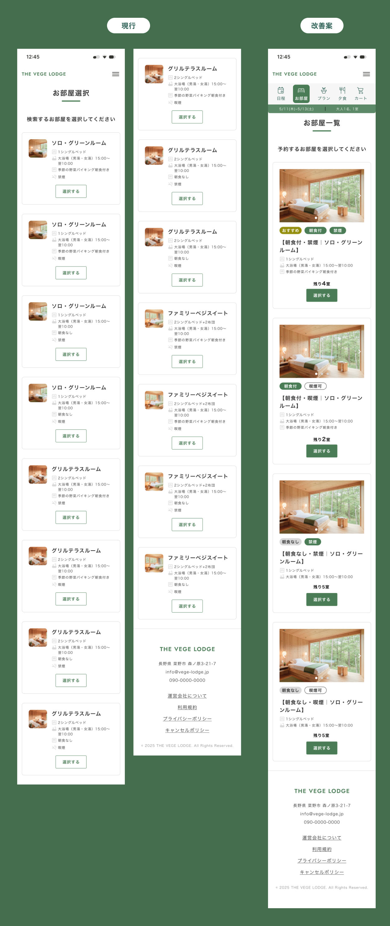 現行は写真が小さくテキストが多いため、部屋のイメージがしにくい・それぞれのプランの違いがわからないことが課題でした。 そこで写真を大きく配置し、詳細条件はタグにし整理しています。 情報を視覚化することで、比較検討のストレスを減らし、離脱防止につながると考えました。
