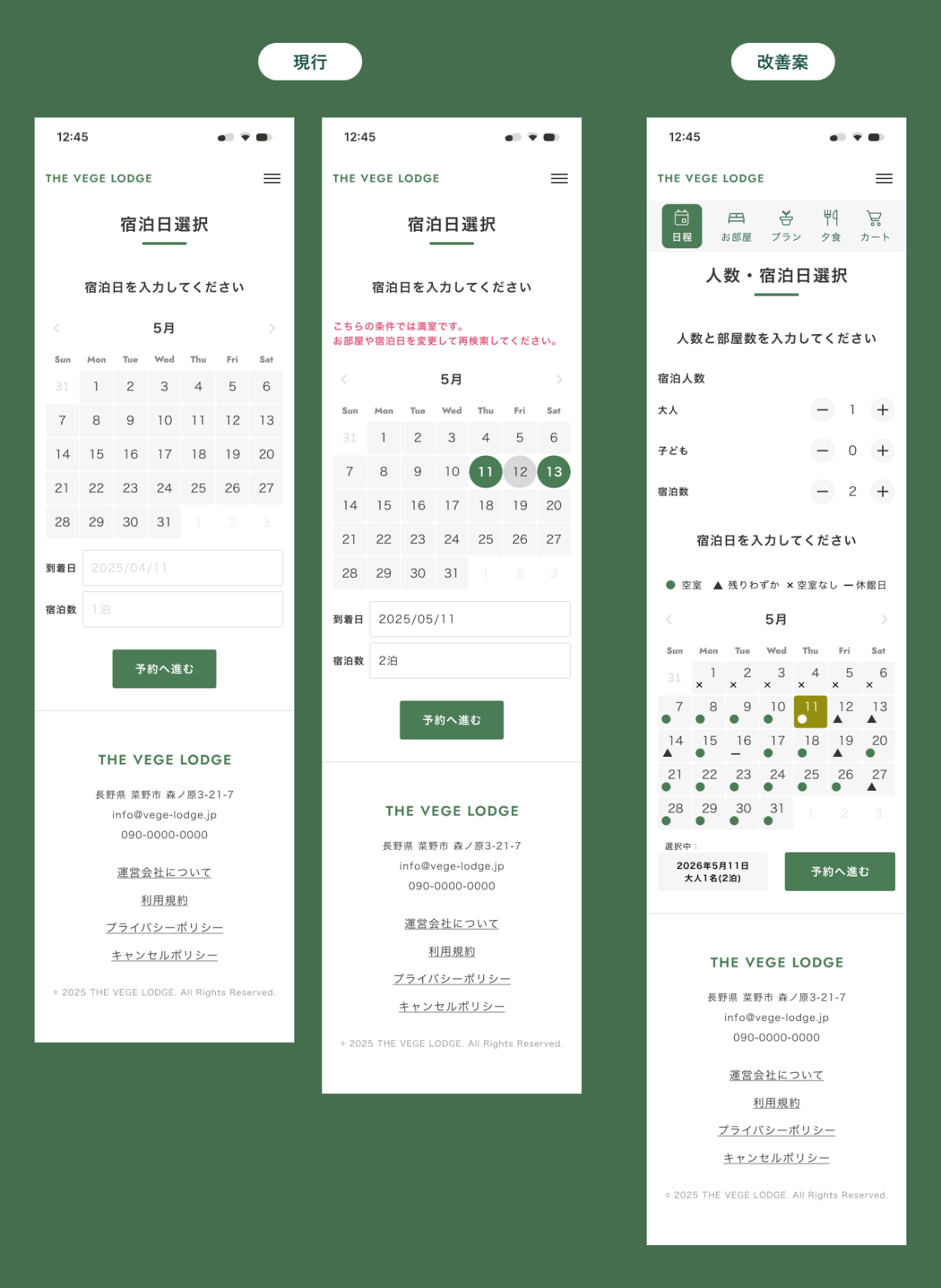 現行の「日程選択後に満室だとわかる」という二度手間の解消のため、最初に「人数・宿泊日」の条件を入力したのち連動したカレンダーで"条件に合う部屋"のみ選択可能に。