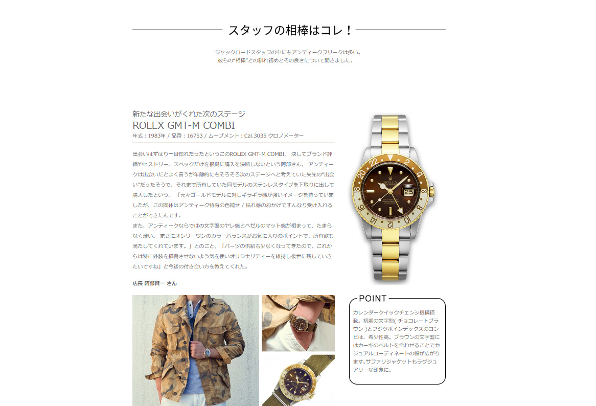 高級腕時計を1本持っている方が2本目として、珍しいアンティークのロレックスなど購入していくお客様も多いことから、男性向けにアンティークの魅力を伝える為のページを制作。