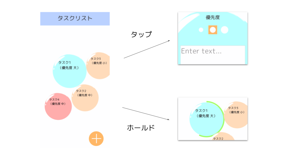 泡には、編集するために選択するときのタップと、消化するときのホールドの2つのアクションが割り当てられています。そのとき、単にボタンコンポーネントを使用するだけだと、タップの判定しかできないため、ホールド時間によって適切にイベントを発火するように実装を行いました。