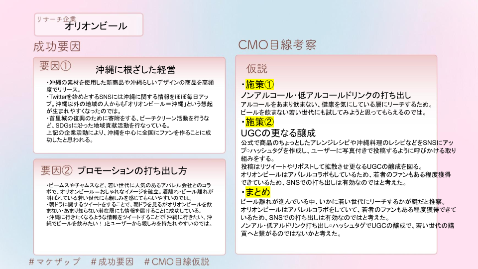 私自身も沖縄が好きなため、どのような施策であればオリオンビールの魅力をより伝えられるかを考え、仮説を立てました。