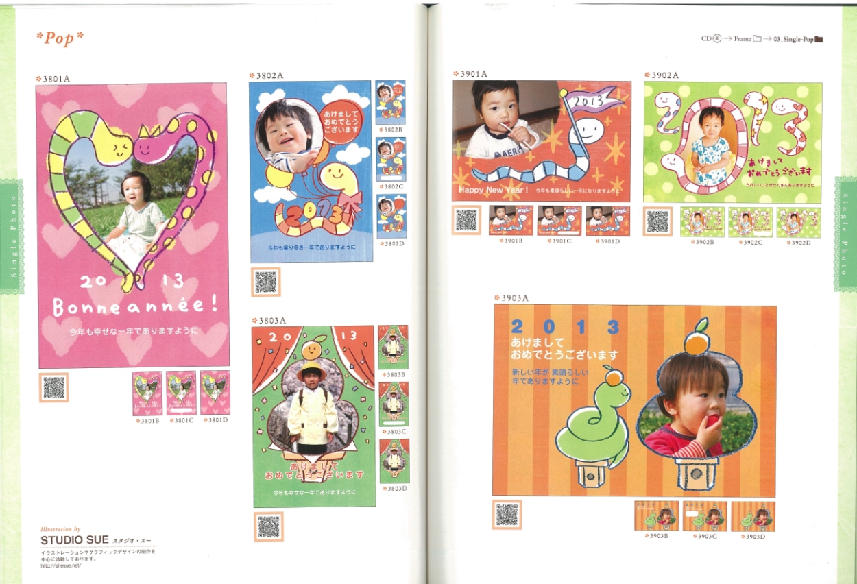 イラストレータースカウト(デザインフェスタなど)、および発注、 本文・年賀状デザイン 小さなお子さんを持つ母親がターゲット。子供の可愛らしさを引き立たせるイラストのフレームの発注およびデザイン。テイストごとにページを分けた検索性の高い紙面構成。 総作業時間1.5カ月