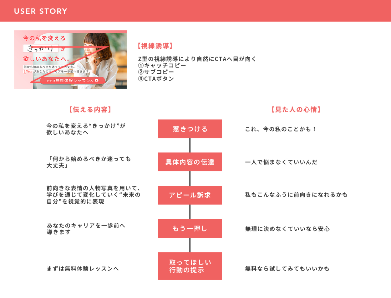 Glow のサービス内容(学び × コミュニティ × キャリア支援)から、 「悩みを抱える女性が、希望を持って一歩踏み出すストーリー」を設計しました 。 特にターゲットは「迷い・不安・期待」が混ざった心理状態であるため、 悩みに共感する言葉 、未来に向かって動き出せるイメージ この2軸の両立が行動を最大化すると考えました。