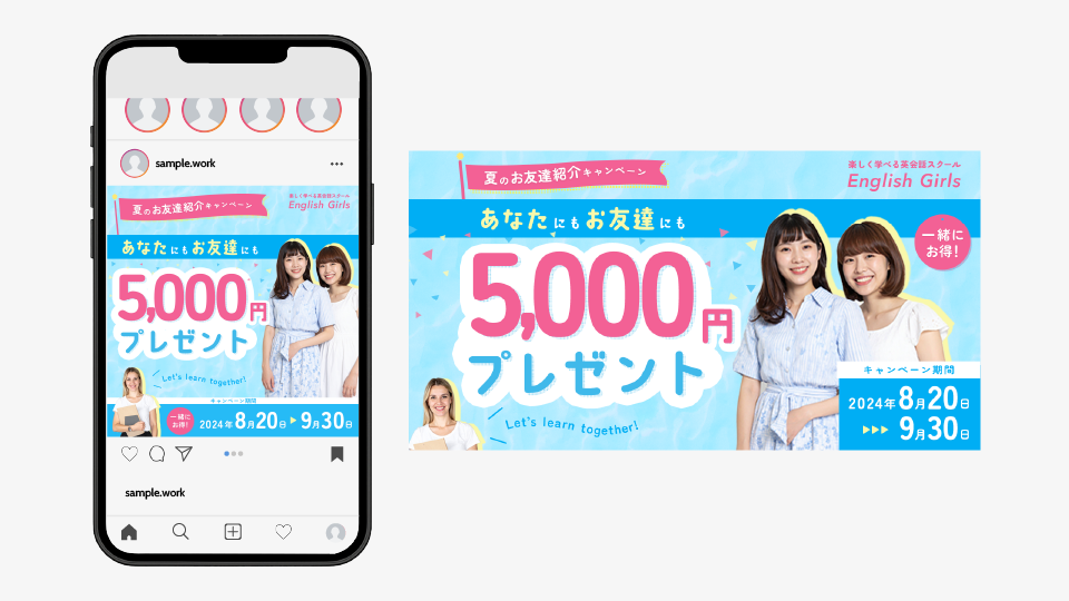 InstagramやXの広告は、注意してみてみよう、と思ってみている方は少ないと思います。そのため、初めにみた時に「5000円プレゼント」を大きく配置し、印象が残るようにしました。「5000円プレゼント」の文字から興味を持った方が、英会話教室の夏のお友達キャンペーンであることがわかり、友達の顔を連想できるよう、ターゲット層と同年代の二人組の女性を大きく配置し、自分へ向けた広告であることがわかるようにしました。その後、期間へ目がいき、詳細へ飛ぶ、という流れをイメージしてバナー作成を行いました。