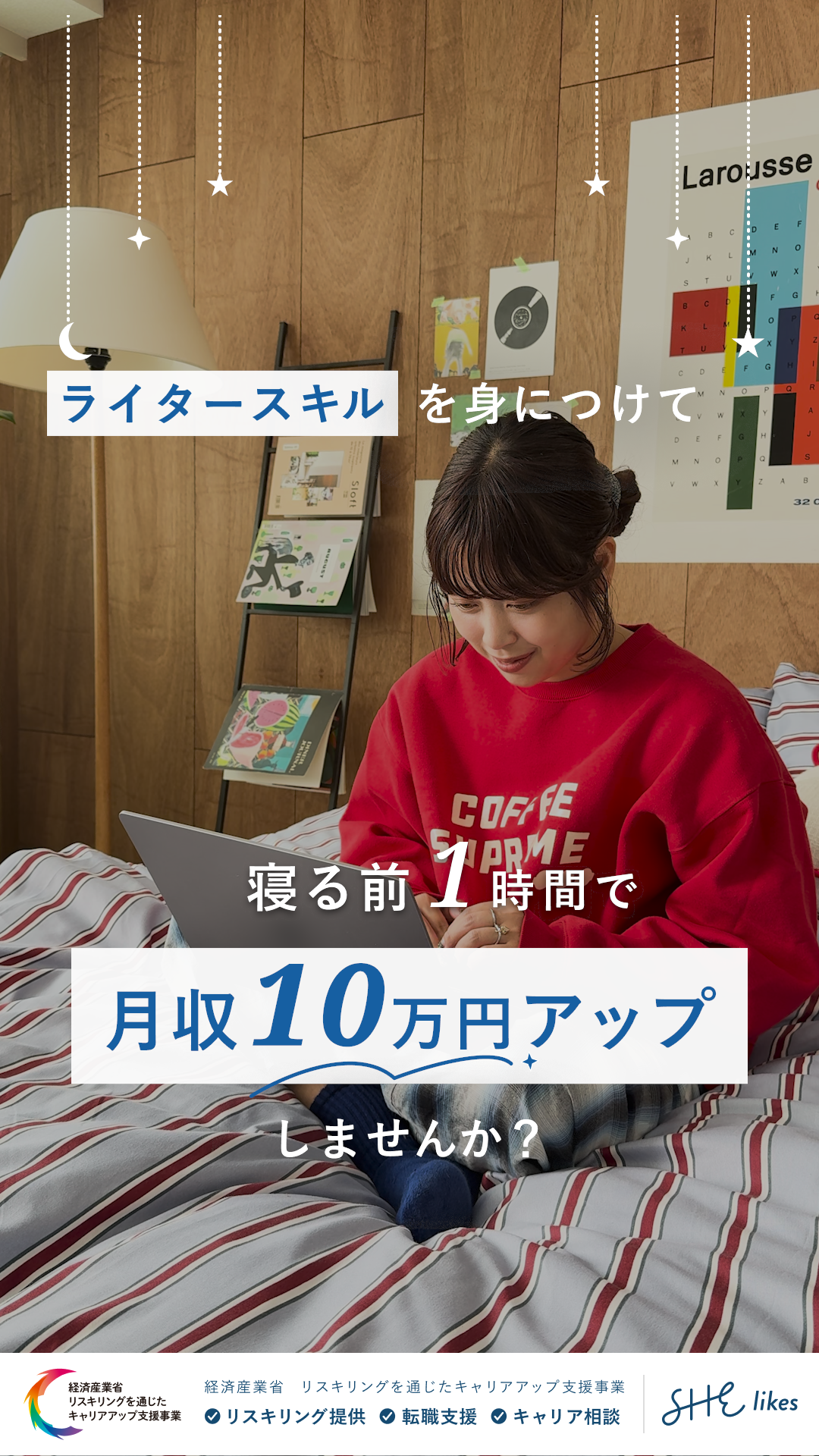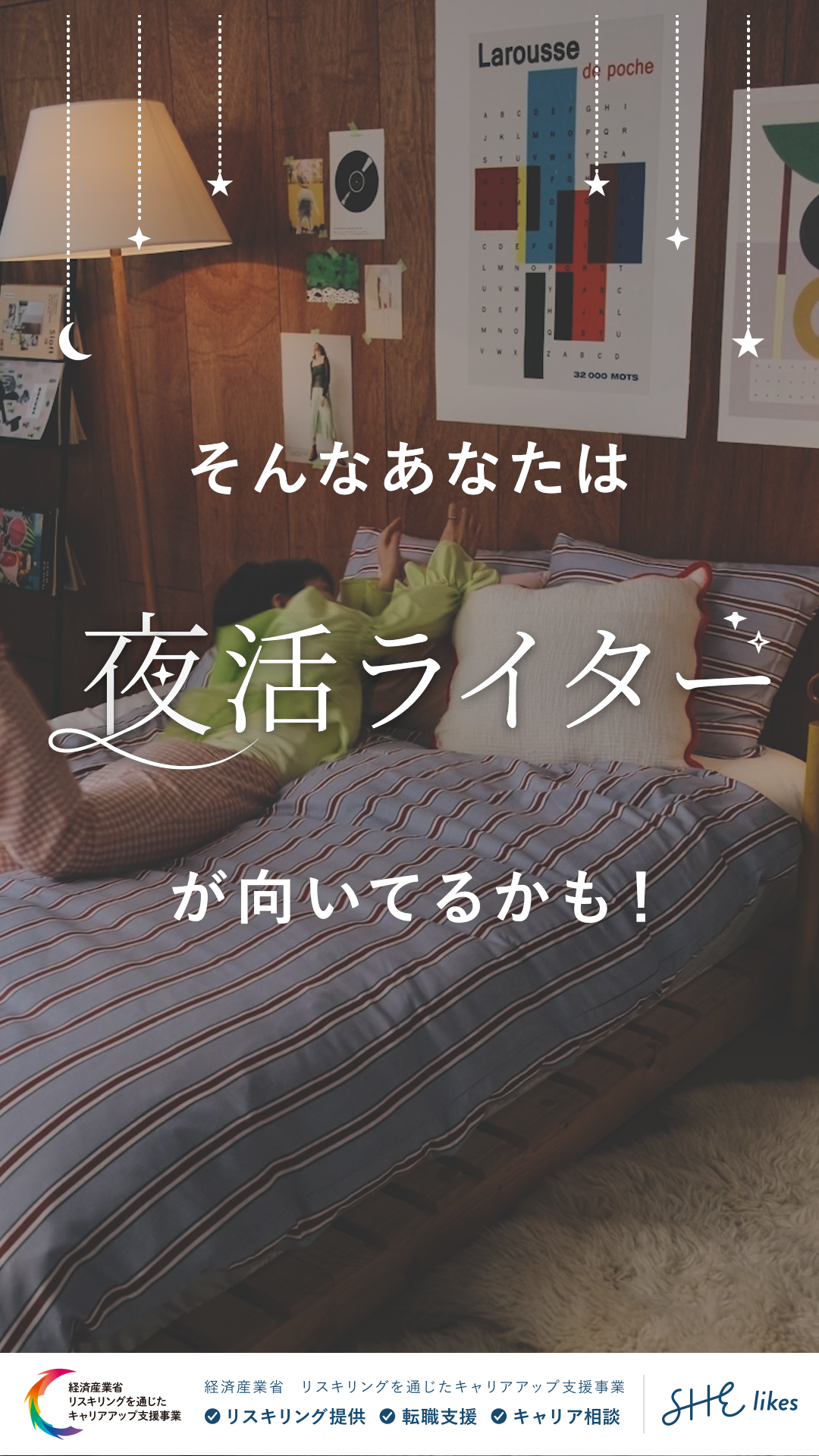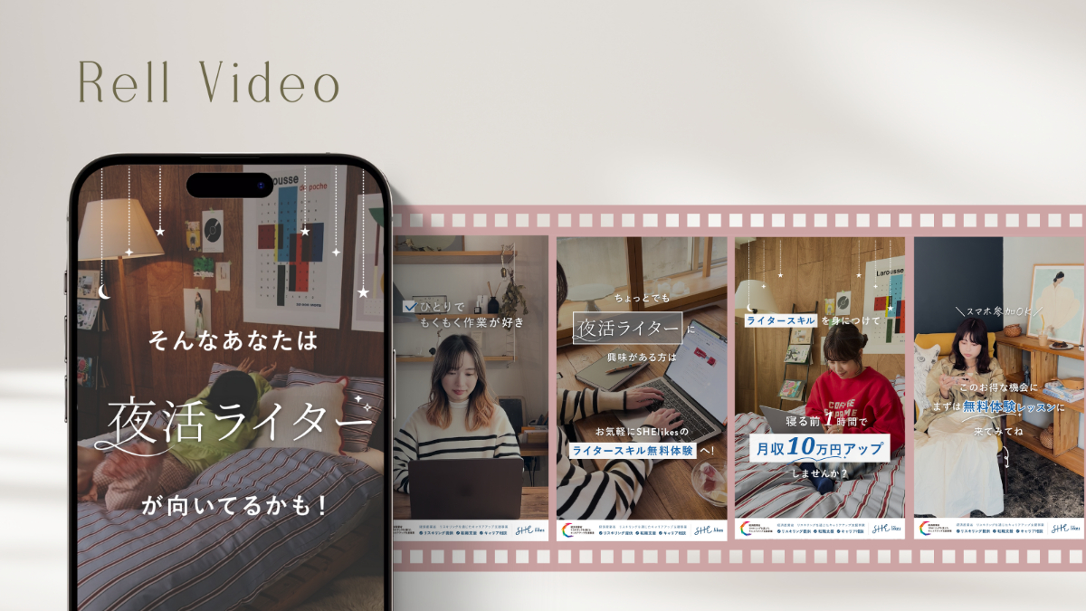 女性向けキャリアスクールを運営するSHE株式会社様のサービス「SHElikes」のSNS掲載リール動画を制作しました。いただいた絵コンテと素材をもとに、テロップのデザイン・動画全体の制作を担当しています。