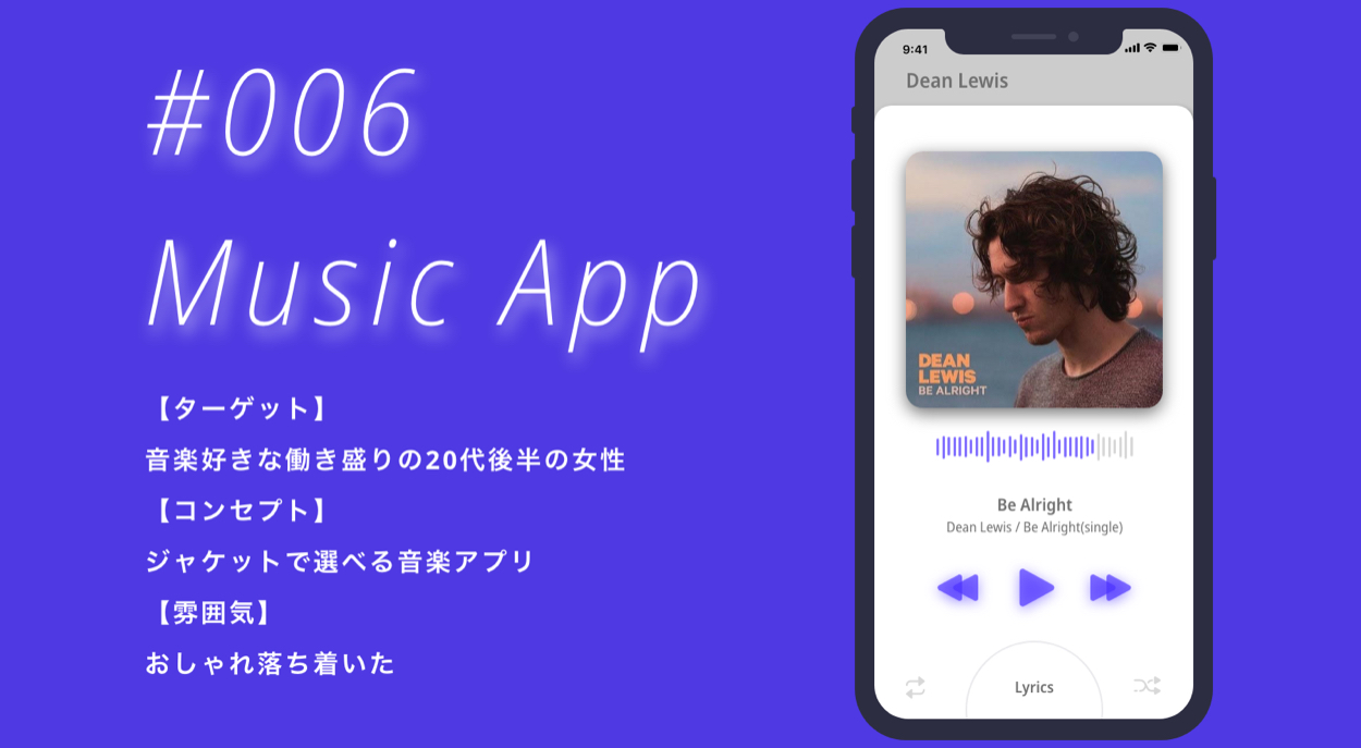 お題のターゲットやコンセプト、雰囲気から、リラックスした音楽の好きな知り合いのお姉さんをペルソナとしてデザインしました。ジャケットを目立たせるようにデザインし、音楽の進み具合は、その曲の波形でデザインされています。また、操作する際の気持ちよさも重視したかったので、色味や透明感、ドラッグアップして上がってくるリリックスなども工夫した点です。