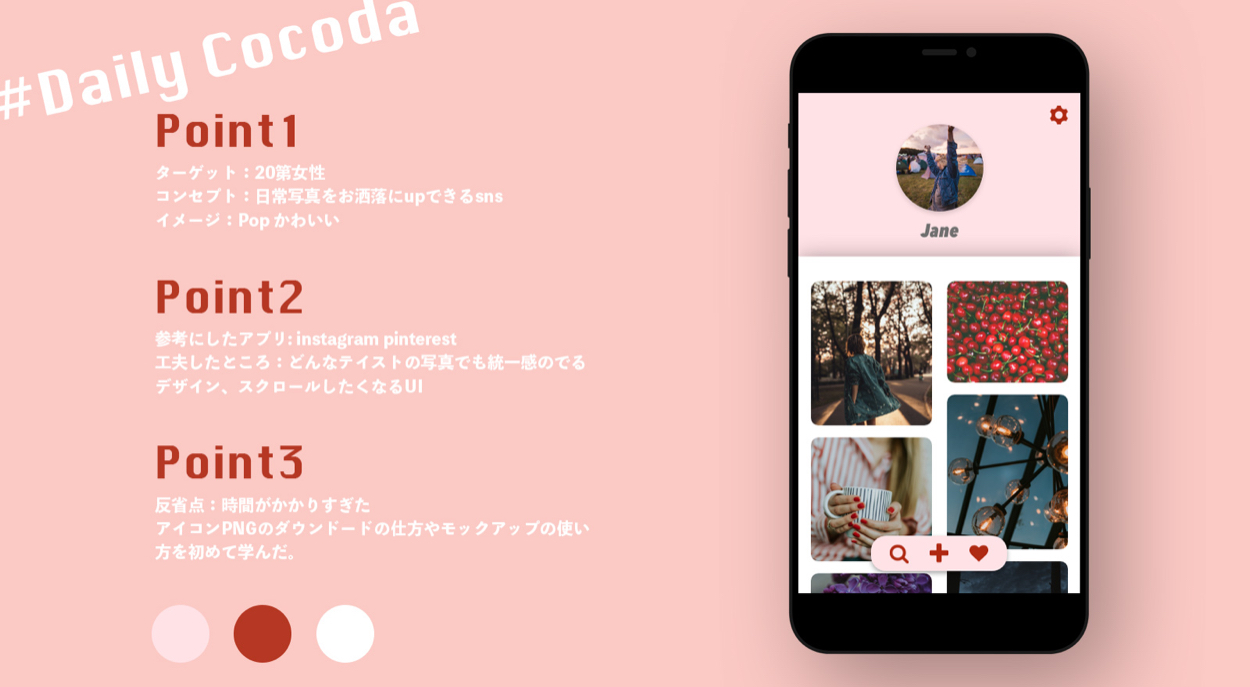 今回は、日常の写真をお洒落にアップできるという提示されたコンセプトのを、「自分のアップした日常写真に、統一感を持たせて表示できる」というように噛み砕いて、プロフィール画面を作成しました。
