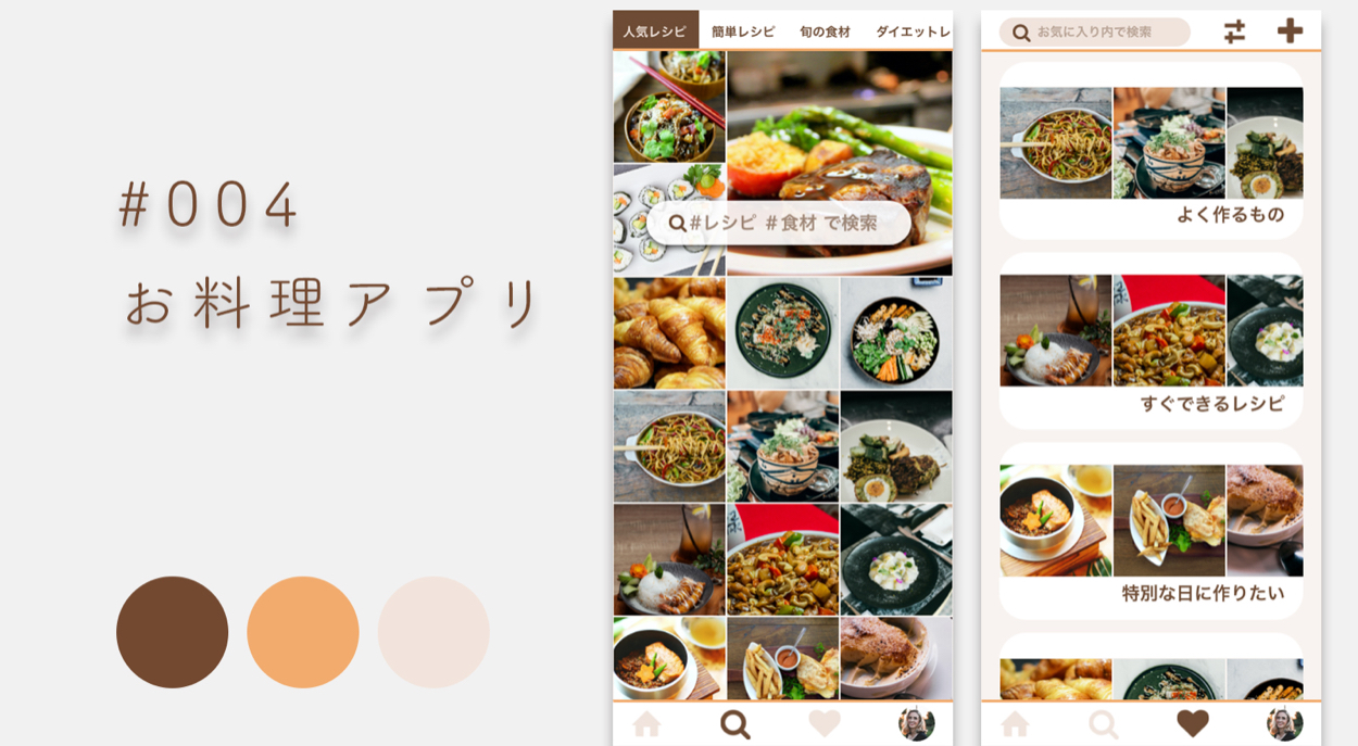 お料理アプリの検索画面と、保存したお気に入りのレシピを見れる画面をデザインしました。