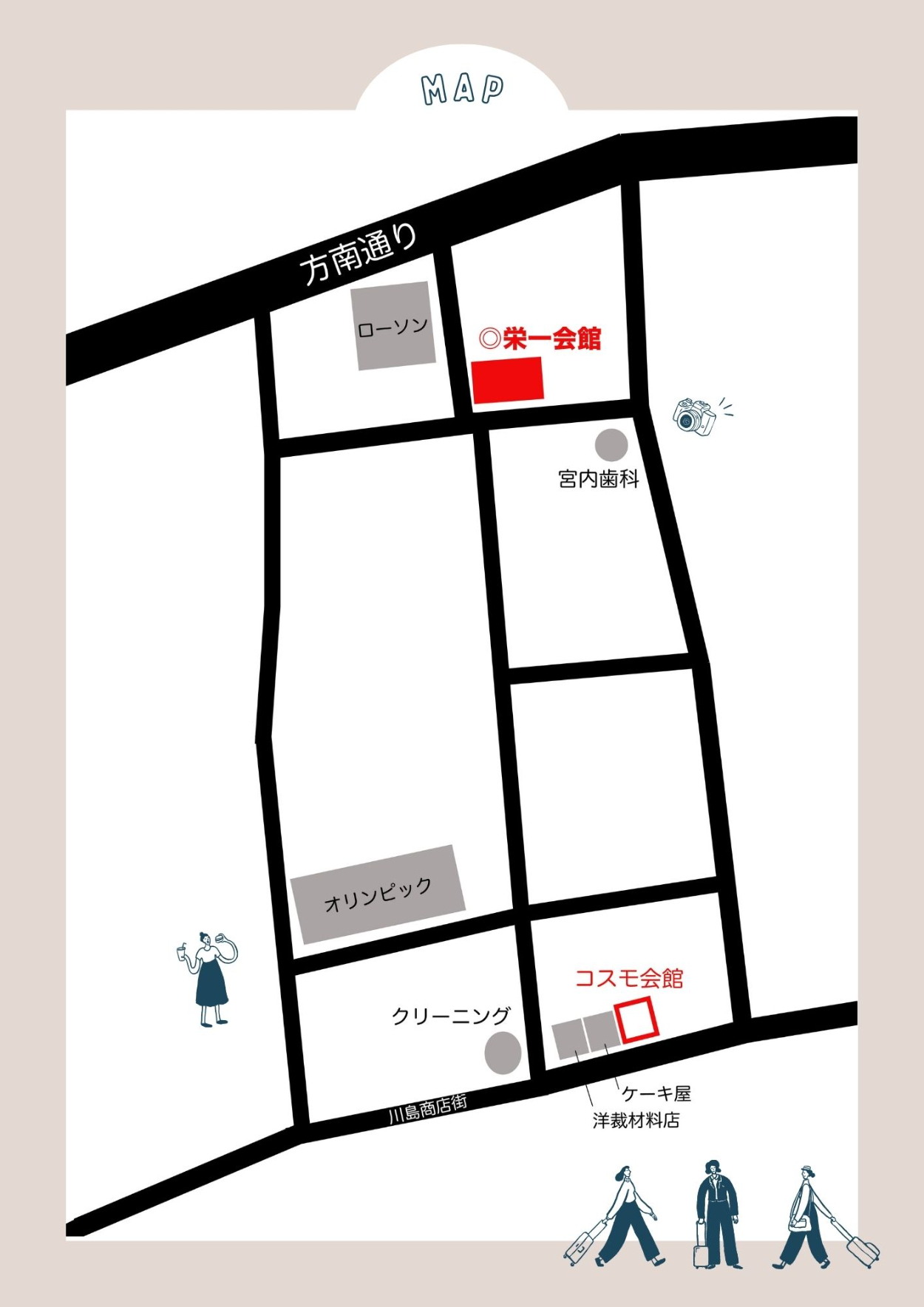Photoshopでオリジナルの地図を制作。実際の来場者が迷わず到着できることを目的に、目印となる店舗・施設のみに情報を整理しました。不要な装飾や細かい道路情報を省き、ブロック構造を単純化することで位置関係を直感的に把握できる設計にしています。会場は赤で強調し、視線が最短距離で目的地に到達するよう配色でコントロールしました。