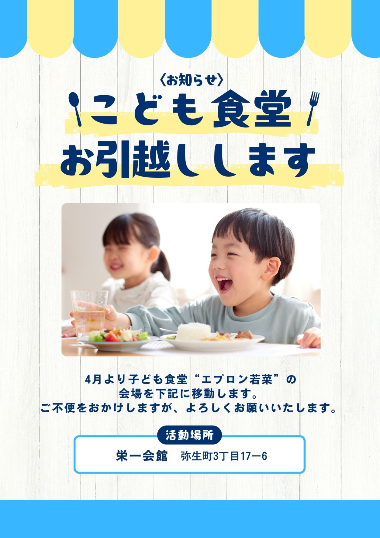 親族が携わっている子ども食堂ボランティアの、店舗移店告知用のチラシを作成しました。【制作期間:3日間】【使用ツール:Photoshop、Canva】