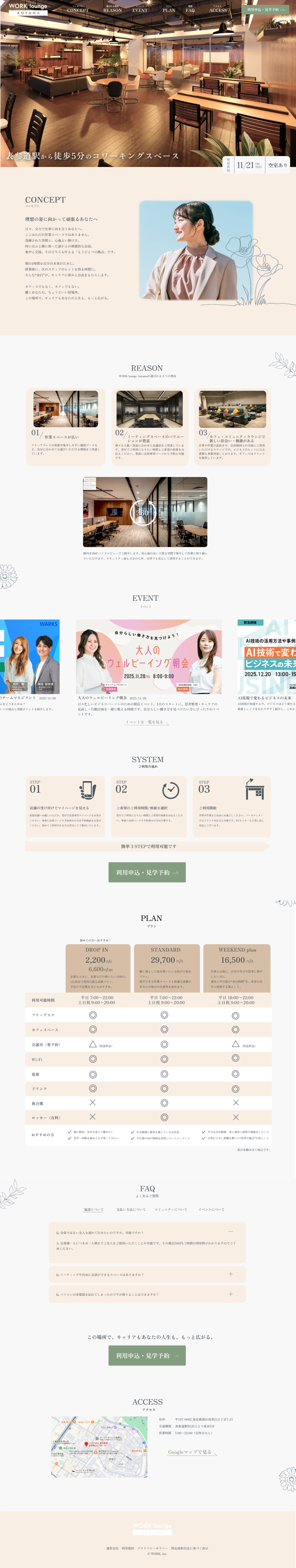 ファーストビューでは、空間の魅力が直感的に伝わるビジュアルを中心に配置し、コンセプトや価値が無理なく理解できる流れを意識しています。