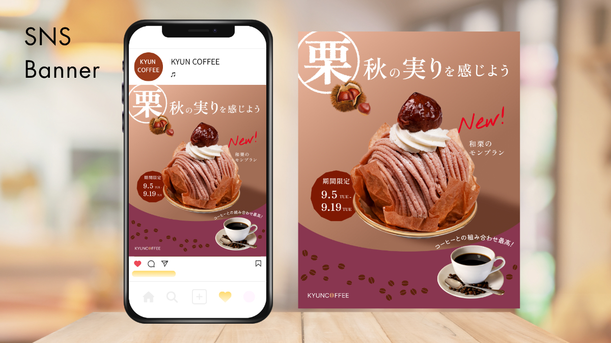 架空のコーヒーショップKYUNCOFFEEの秋の期間限定でスイーツ紹介バナー 使用ツール|Figma 製作期間|1週間