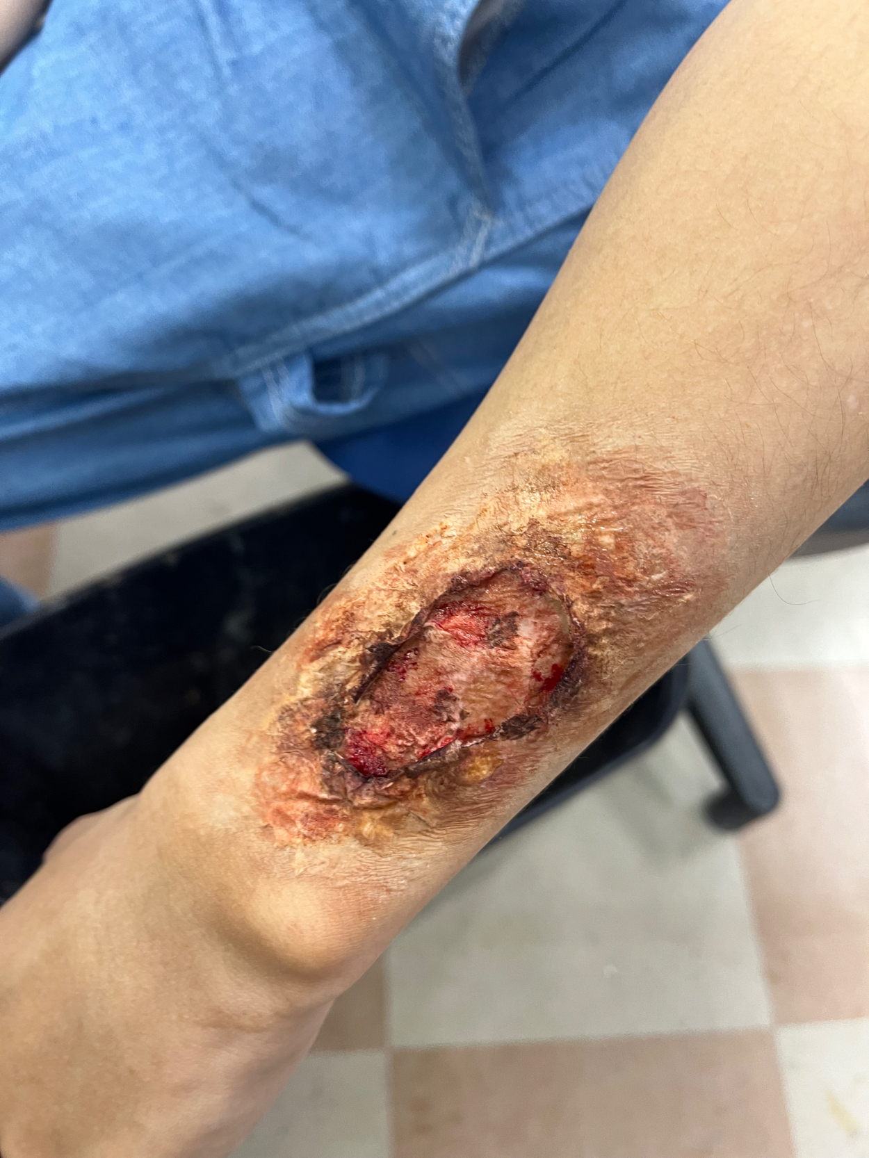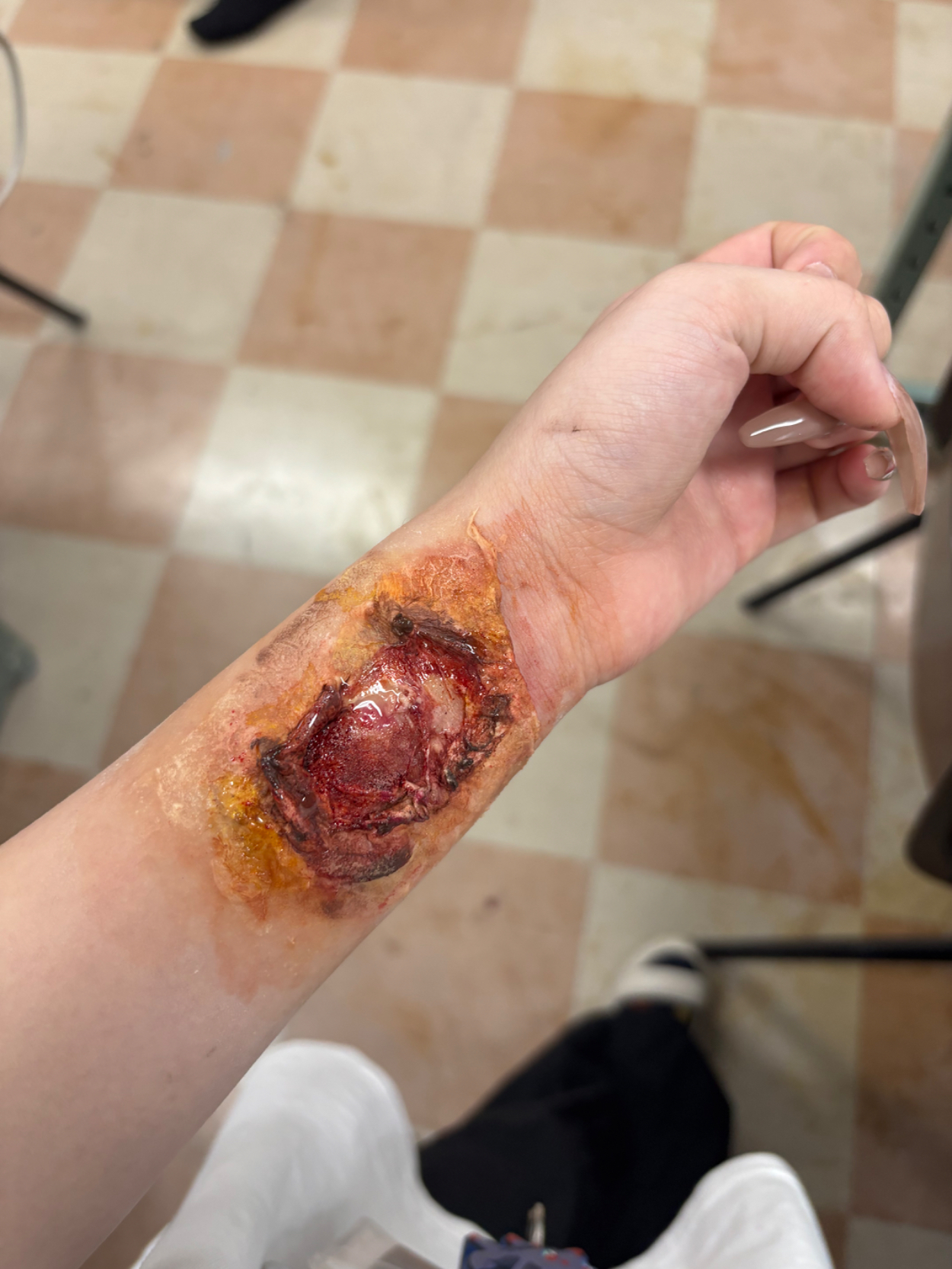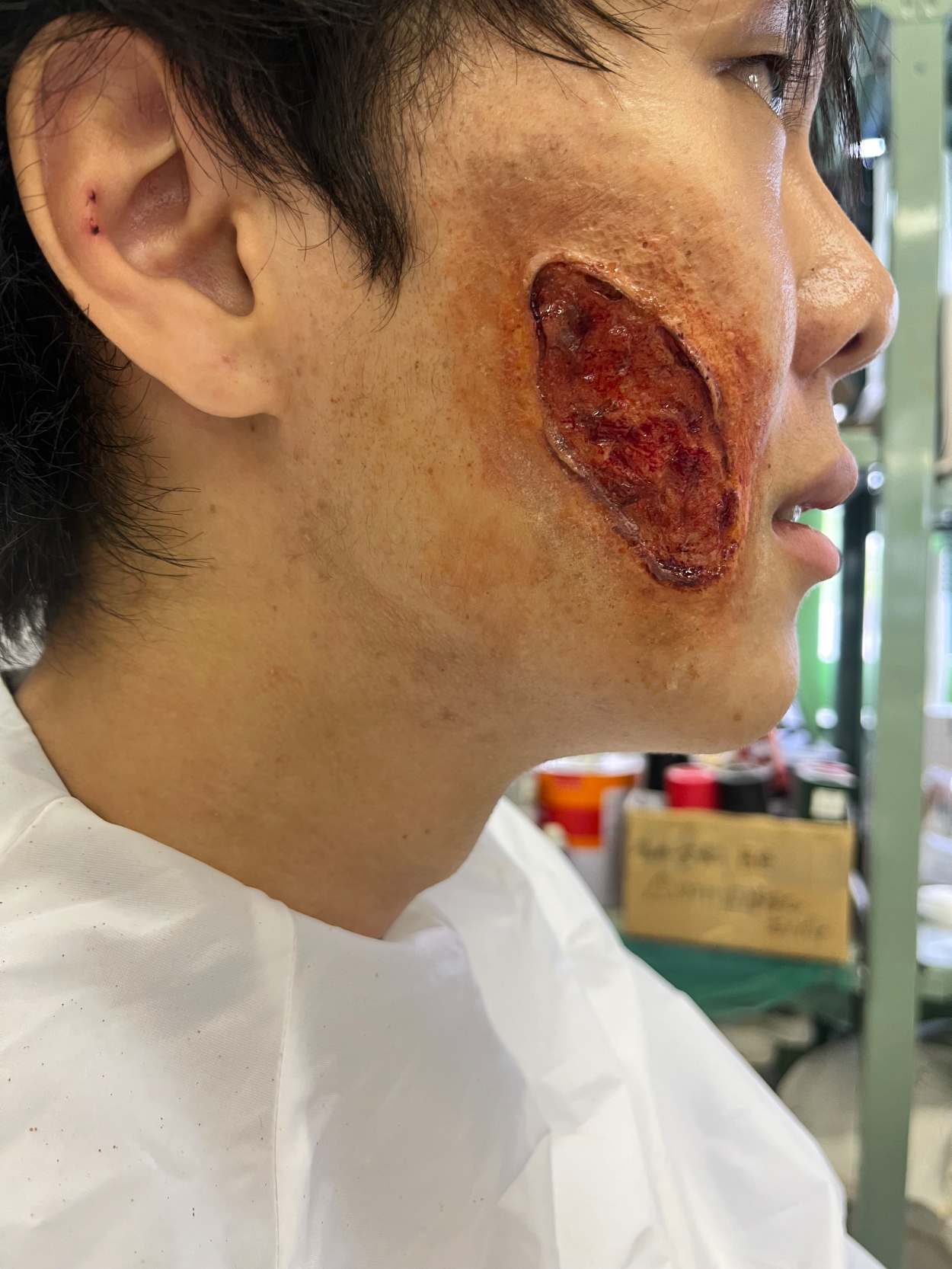 傷メイク ささ 特殊メイク専門学生 【1枚目】切り傷/ワックス【2枚目】火傷/ラテコットン【3枚目】火傷/ラテコットン【4枚目】薬品火傷/プロスエイドカボシルトランスファー【4枚目】カサブタメイク/ケロスキン