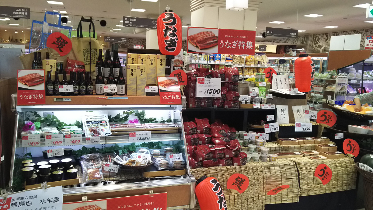 【テーマ】 客単価が高くなる丑の日需要を取りこぼさず、稼ぎきるためにエントランスすぐの一等地にて展開訴求。