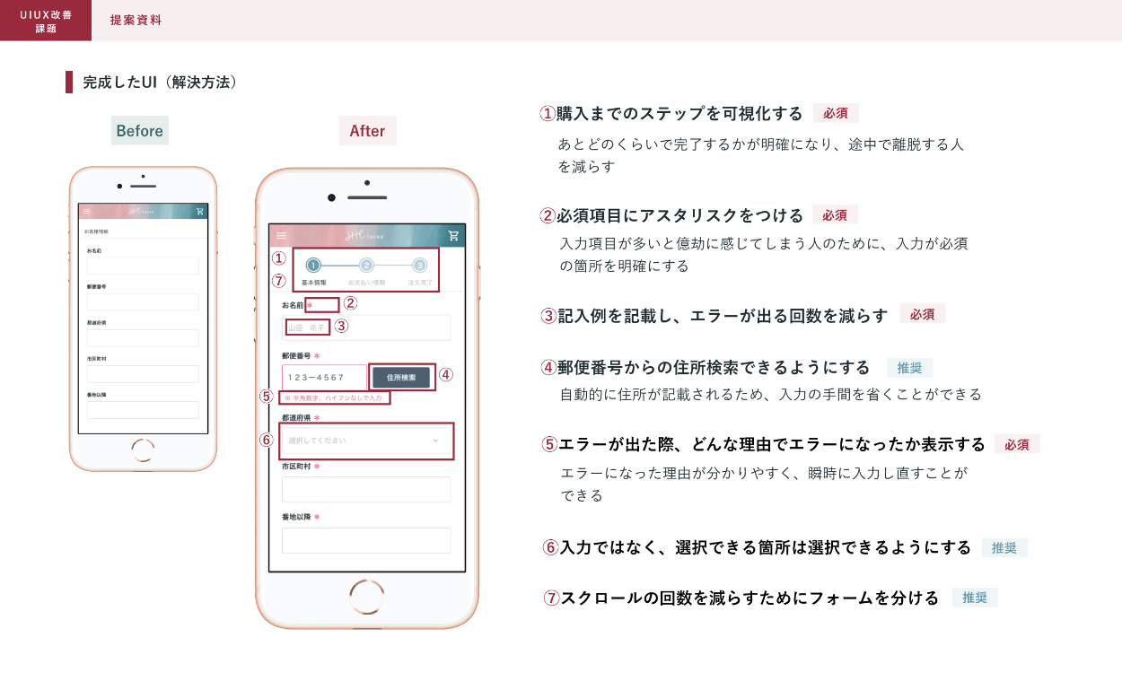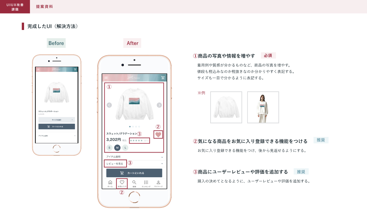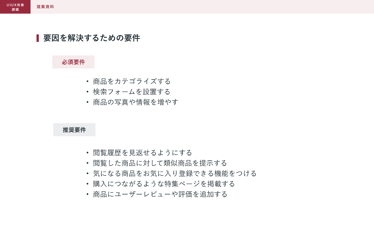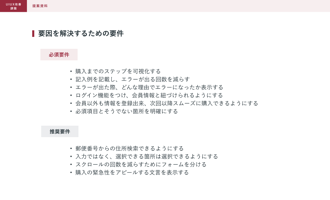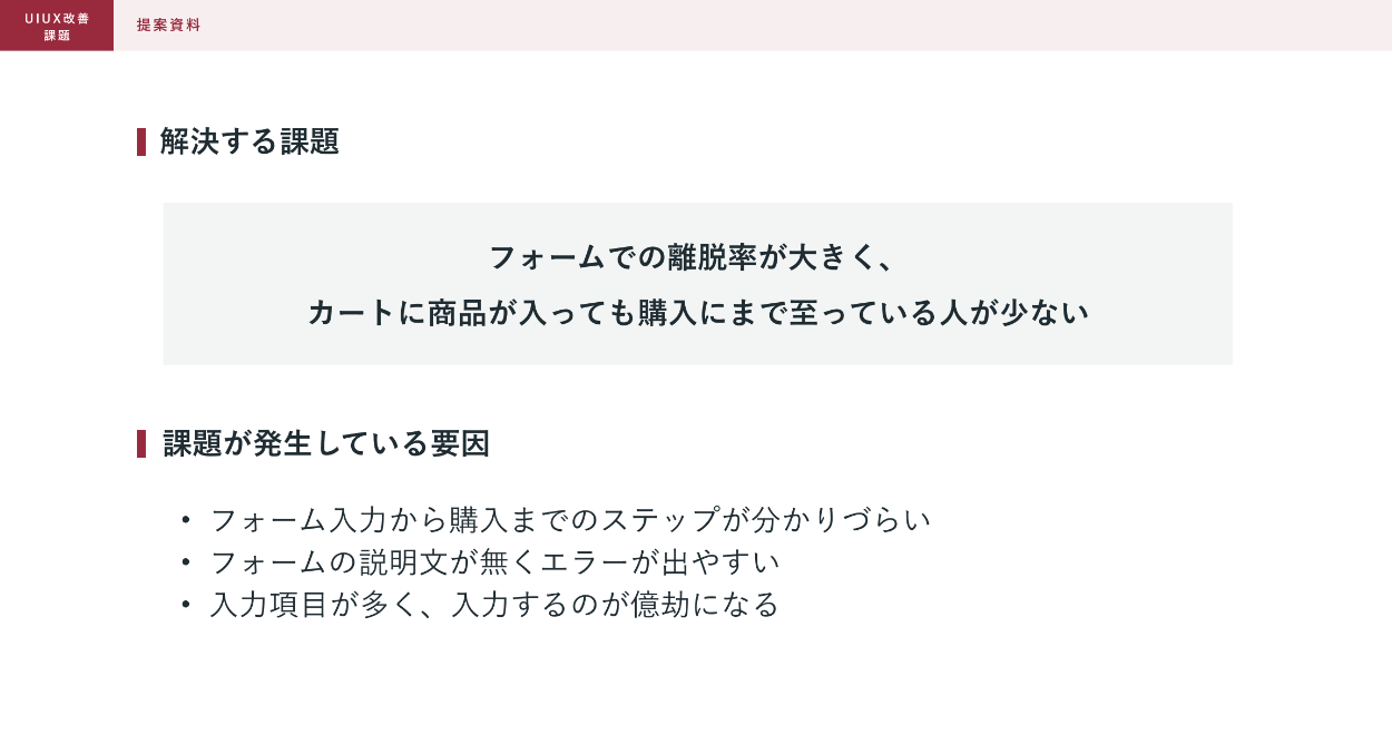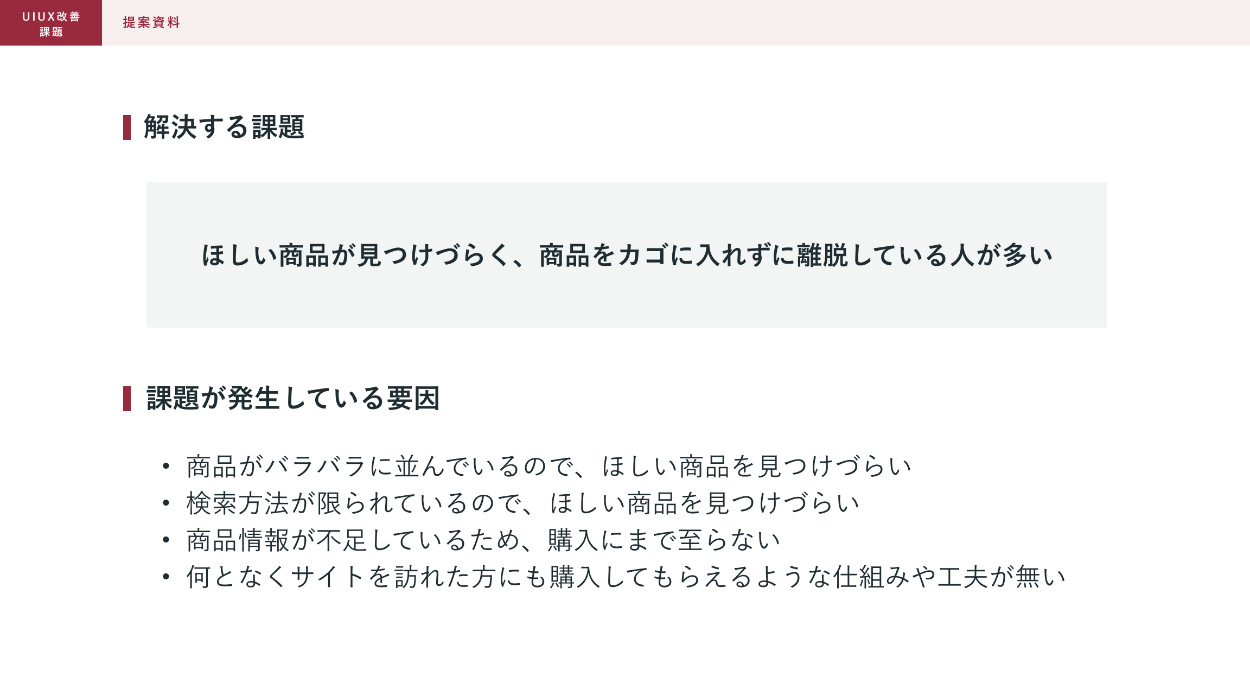 クライアント(仮想)から「ECサイトの売上を更に伸ばすために、UI/UX改善に取り組みたい。課題感を共有するので解決案を提示してほしい。」という依頼があり、下記2点の課題解決に向けて提案資料を作成いたしました。