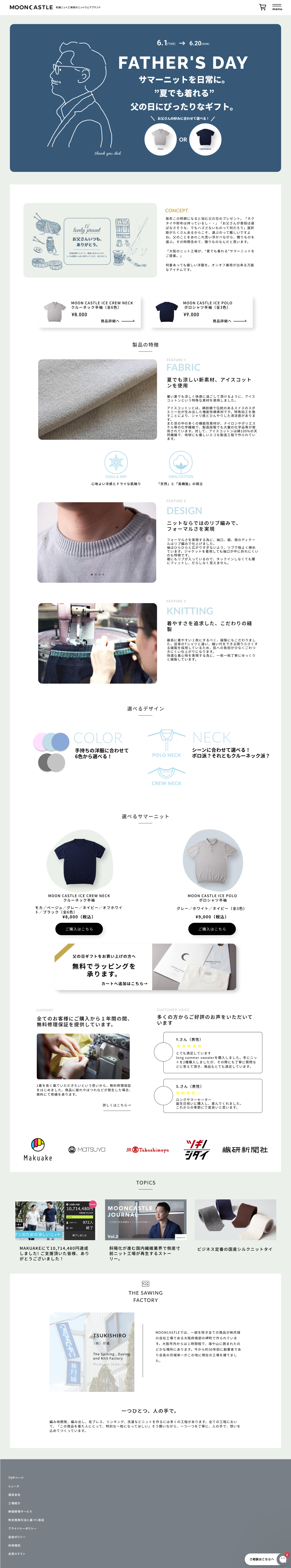 MOONCASTLEは大阪にある1966年創業のニット工場が手がけるブランド。今回は父の日のギフトとして、2種類のニットの購入をコンバージョンとしてページの制作を行いました。